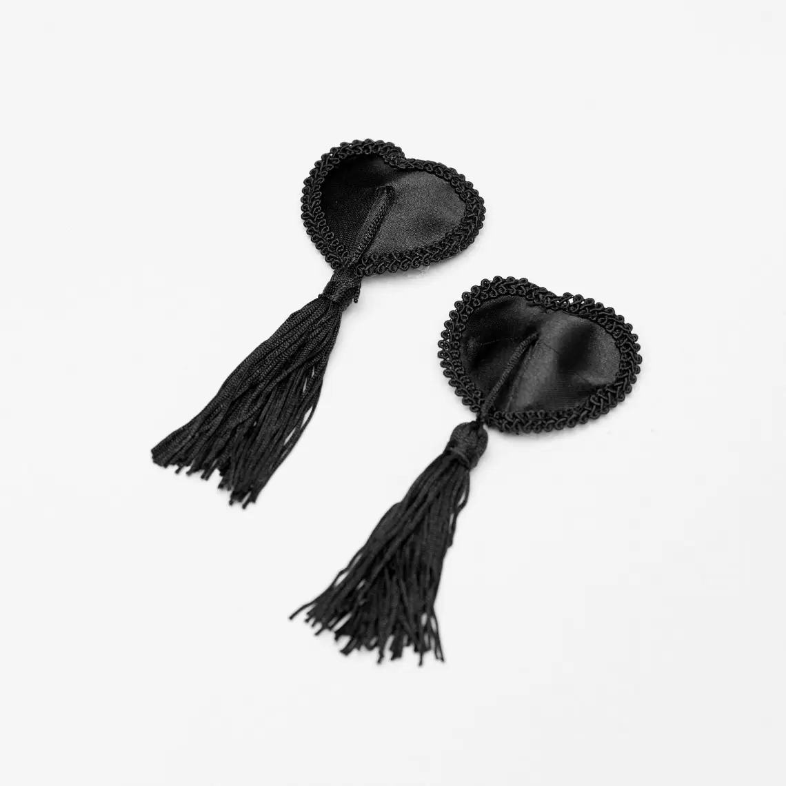 Ці накладки на соски — це аксесуар для чуттєвого збудження. Чорного кольору, вони мають спокусливу форму серця, що символізує пристрасть. Прикрашені грайливими китицями, вони створюють інтригуючий рух, посилюючи відчуття та розпалюючи вогонь бажання.