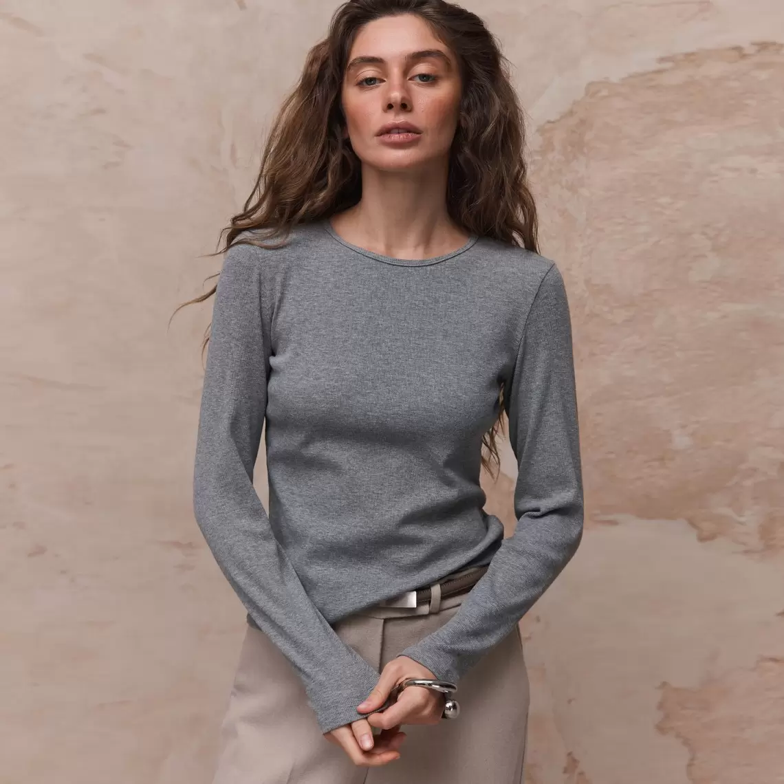 Базовий сірий лонгслів. Виготовлений з м'якої тканини у рубчик. Бавовна 46%, віскоза 46%, спандекс 8%.