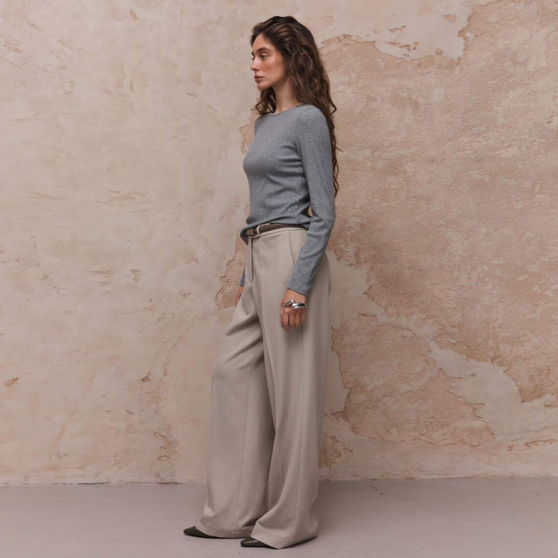 Базовий сірий лонгслів. Виготовлений з м'якої тканини у рубчик. Бавовна 46%, віскоза 46%, спандекс 8%.