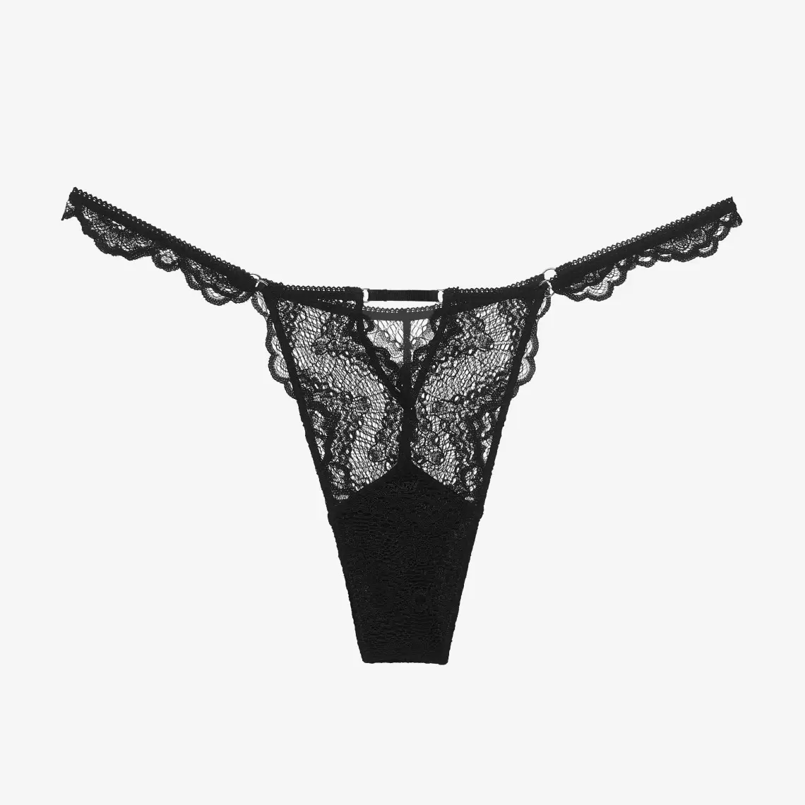 Стрінги з низькою посадкою чорного кольору. Виготовлені з мережива. Ластовиця зі 100% бавовни. Поліамід 69%, еластан 16%, бавовна 8%, віскоза 6%, поліестер 1%.