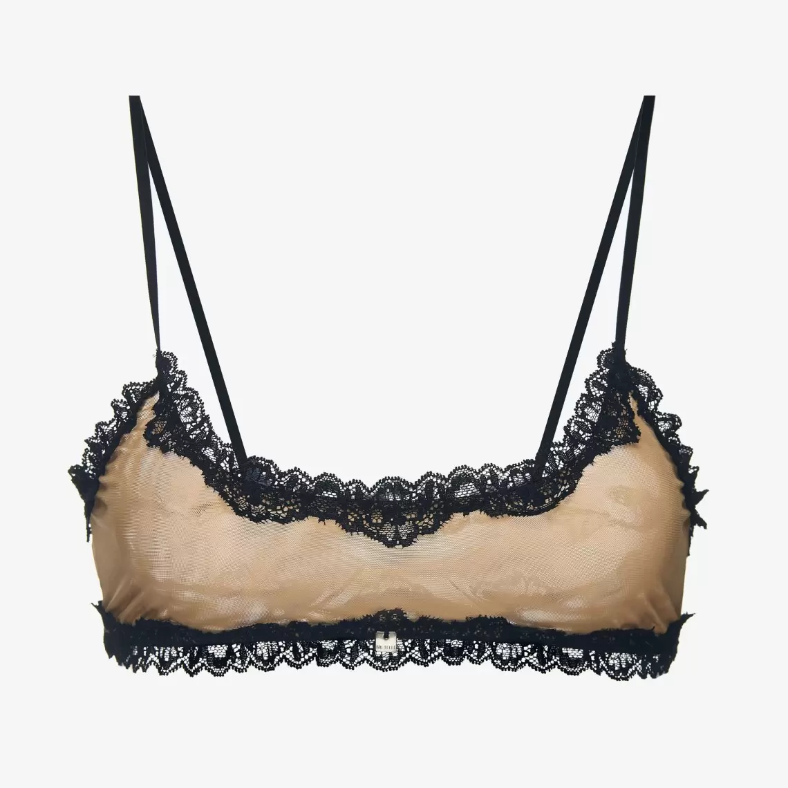 Underwire-free top in cappuccino color. Made from sheer mesh and decorated with black lace on the edges. Cups without foam. The straps are adjustable. Without clasps. 88% polyamide, 12% elastane.