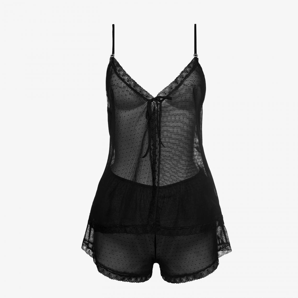 Сексуальний комплект, виготовлений з сітки чорного кольору, яка прикрашена мілким горошком. Складається з топу та шортів довжини міні. Топ на бретелях з регуляторами довжини, які схрещуються на спині, й має зав'язки спереду. Шорти на резинці. Комплект прикрашений мереживом по краях. Поліамід 72%, еластан 18%, віскоза 8%, поліестер 2%.