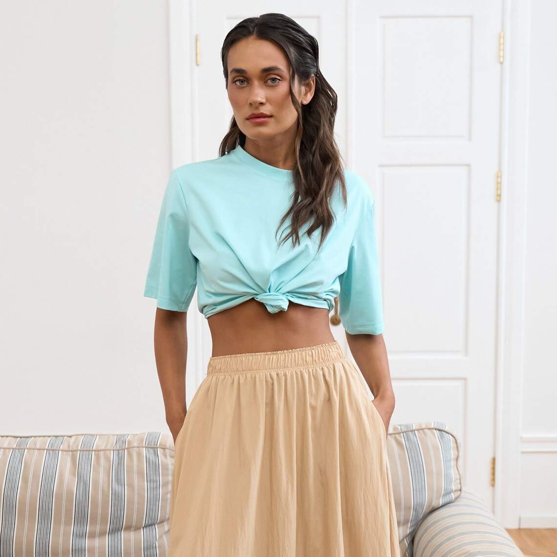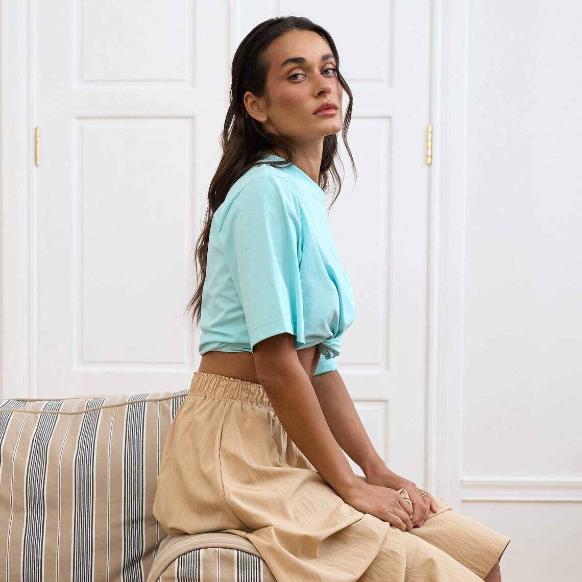 Яскрава жіноча футболка бірюзового кольору стане відмінним доповненням до вашого повсякденного гардеробу. Виконана з бавовни, вона приємна на дотик, дозволяє шкірі дихати і забезпечує комфорт протягом усього дня. Футболка має вільний крій, круглий виріз горловини і короткі рукави, що робить її універсальною і зручною. Вона ідеально поєднується з джинсами, шортами, спідницями та спортивними штанами. Ви можете носити її як самостійний елемент одягу або під жакети та кардигани. Завдяки своїй простоті та універсальності, ця бірюзова бавовняна футболка стане базовою річчю у вашому гардеробі. Склад: бавовна 80%, поліестер 20%