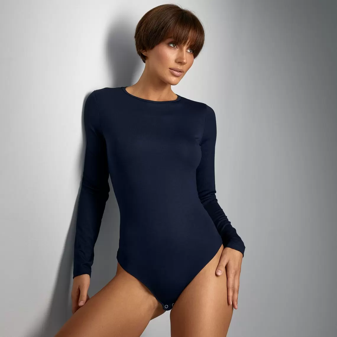 Базове боді кольору темно-синього з довгими рукавами. З круглою горловиною. Без поролону і кісточок. Виготовлене з м'якої трикотажної тканини. Є класична застібка над ластовицею. Віскоза 66%, нейлон 26%, бавовна 8%.