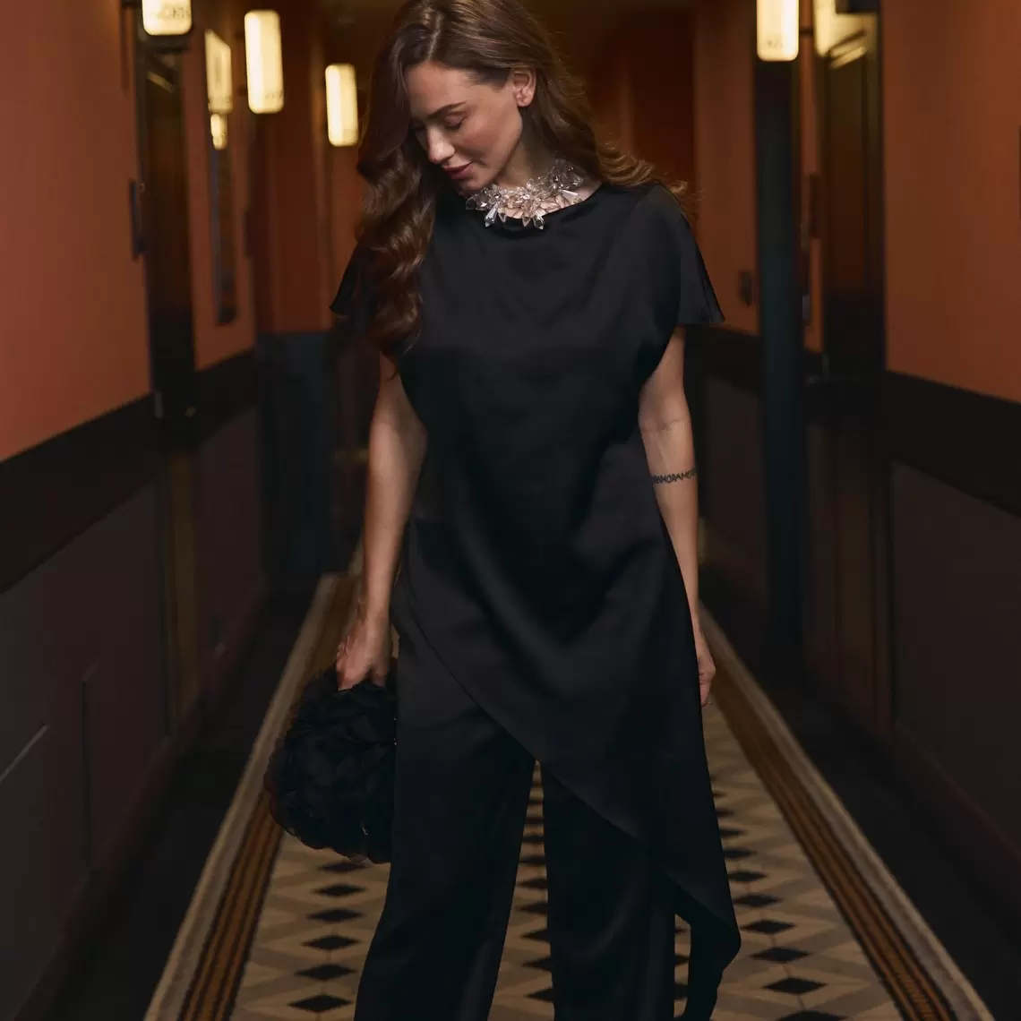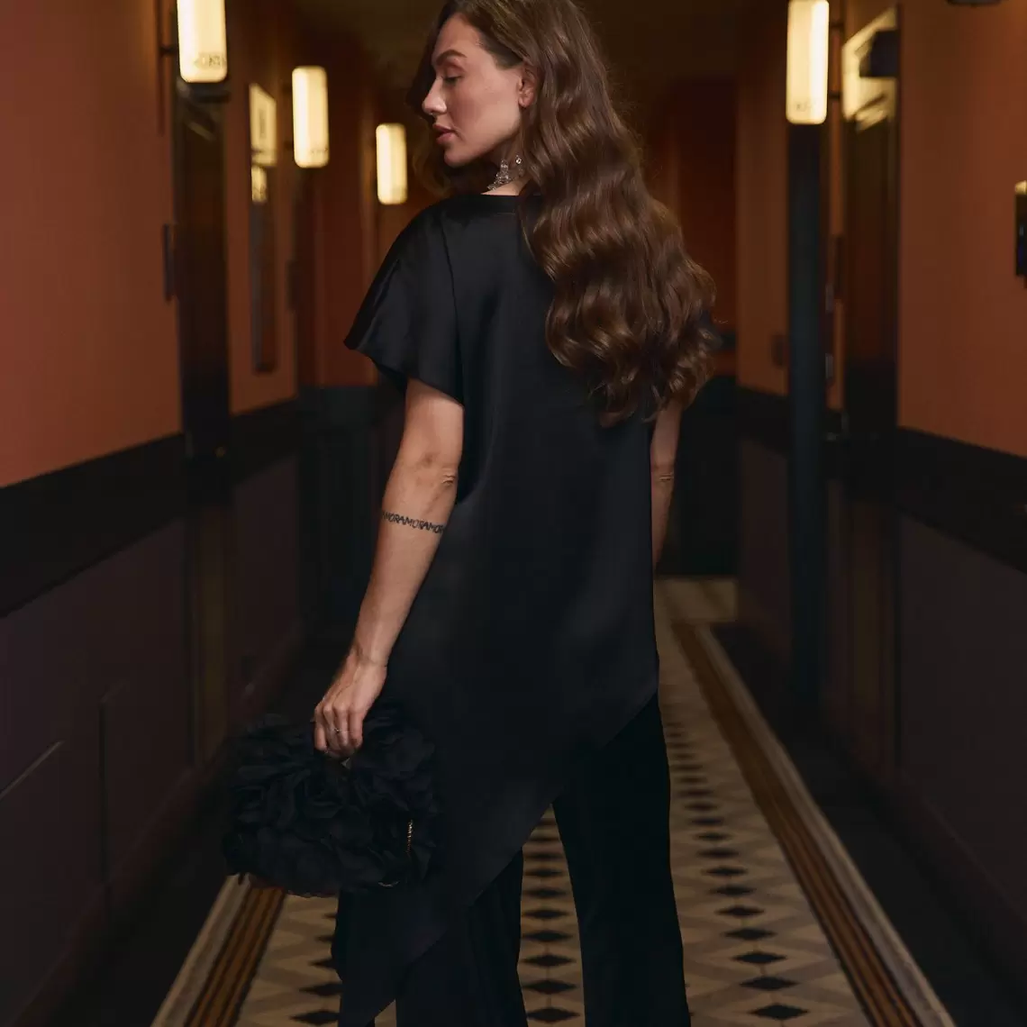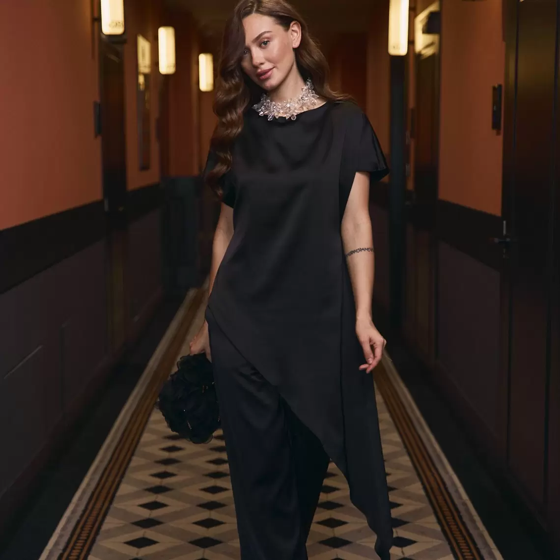Асиметричний топ з круглою горловиною чорного кольору. Вільного крою. З короткими рукавами та без коміру. Виконаний з сатину. Ви можете доповнити його штанами палаццо з цієї ж лінії. Склад: поліестер 97%, спандекс 3%.