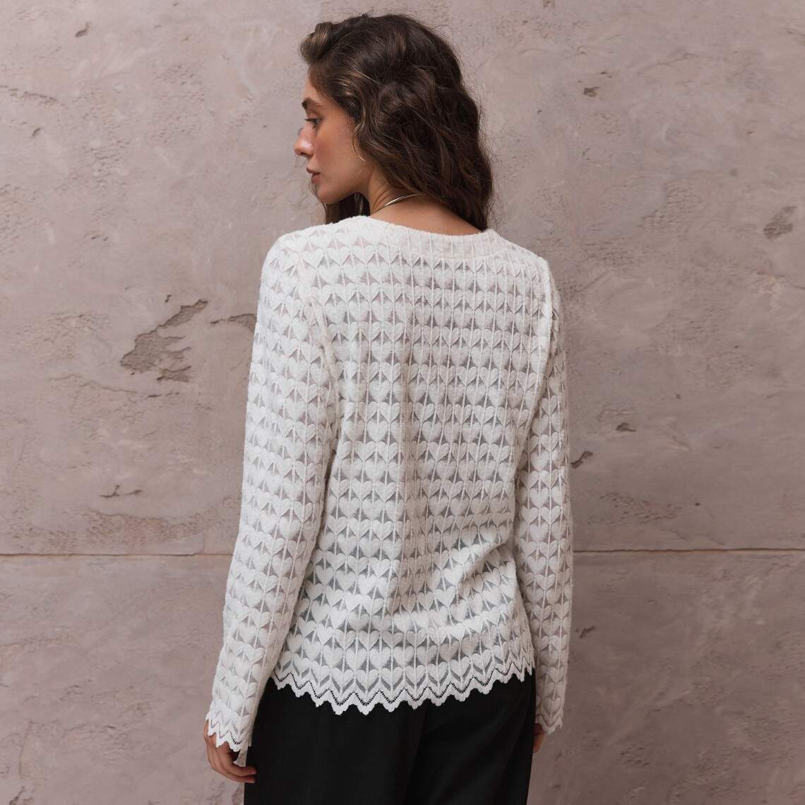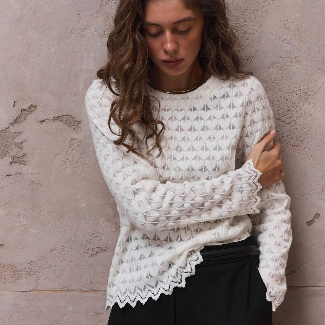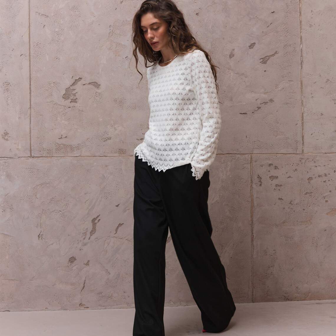Молочний лонгслів з круглою горловиною. Виготовлений з м'якого трикотажу з вираженою текстурою. Нейлон 90%, спандекс 10%.