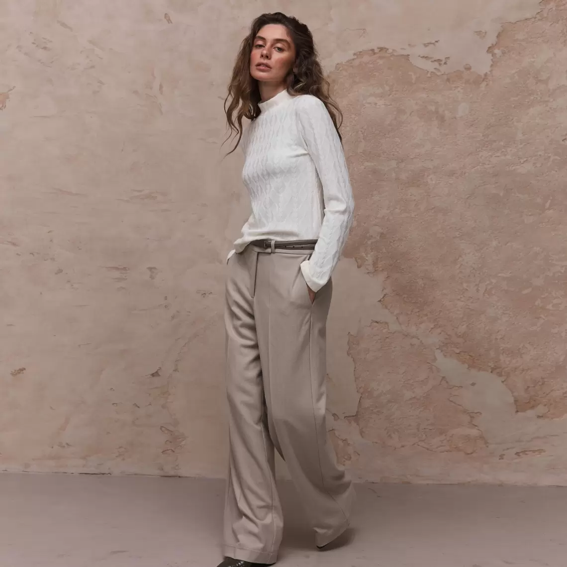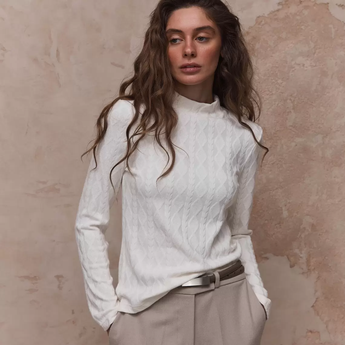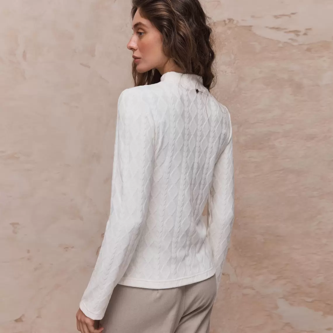 Молочний лонгслів з високою горловиною. Виготовлений з м'якого трикотажу з вираженою текстурою. Район 49%, поліестер 29%, нейлон 19%, спандекс 3%.
