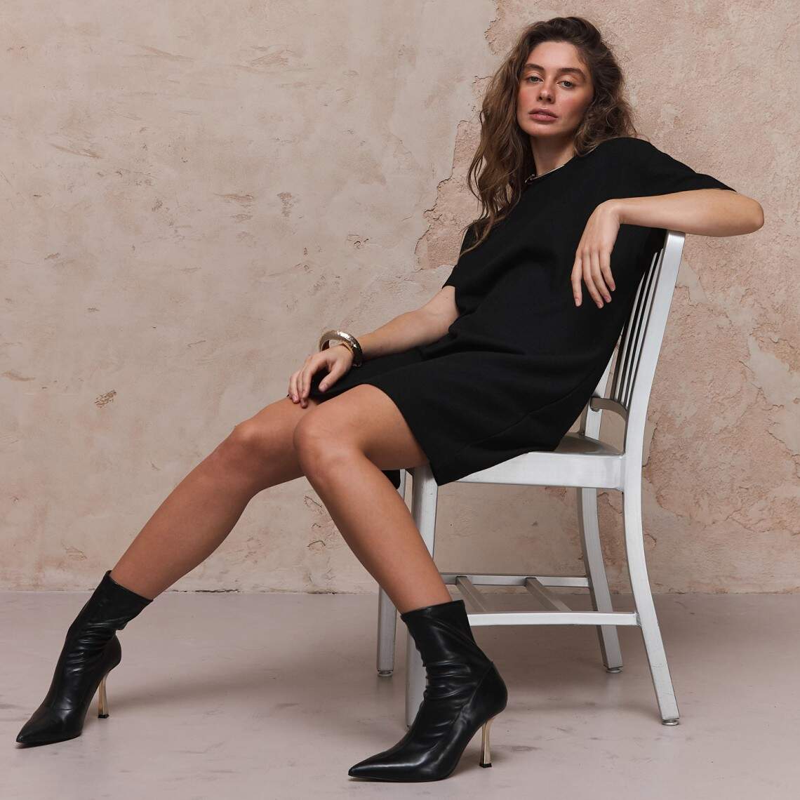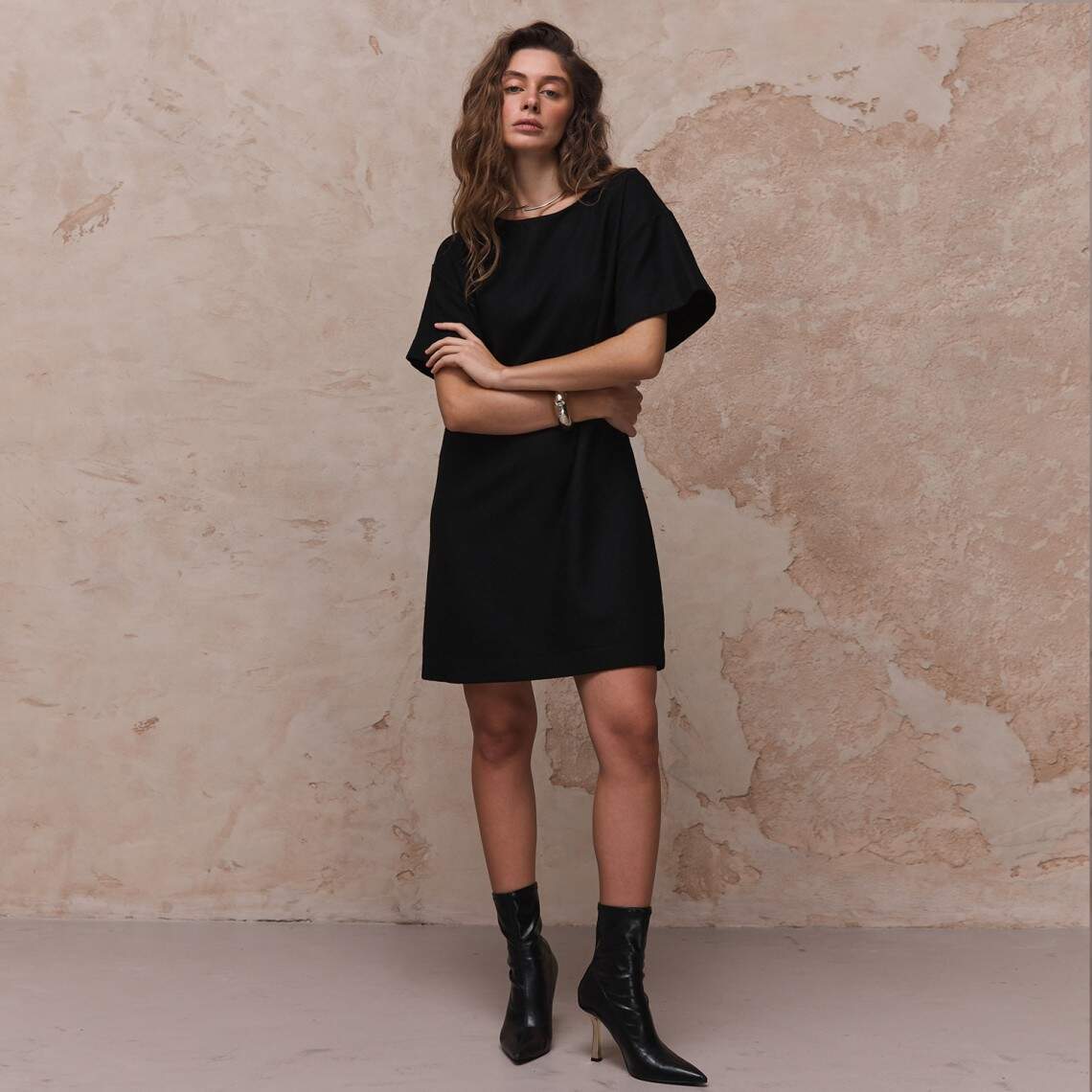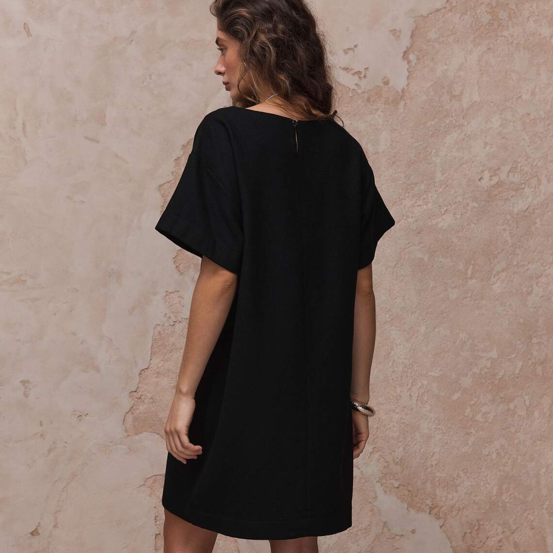 Елегантна сукня чорного кольору з круглою горловиною і короткими широкими рукавами. Виготовлена з тканини з вовною у складі. Міні довжина. Без застібок. Вовна 50%, поліестер 50%