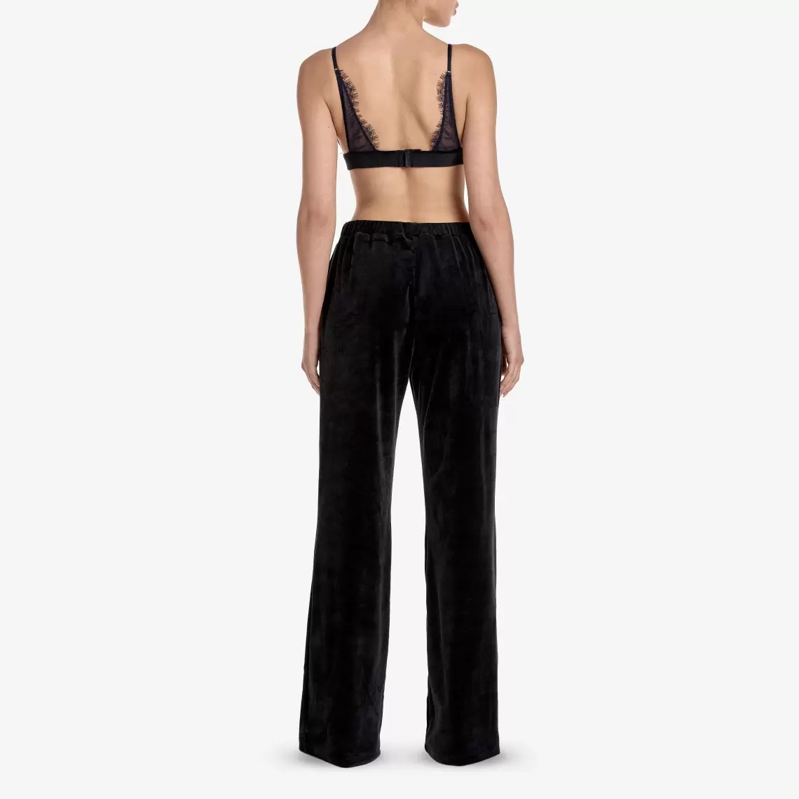 Ці домашні штани — втілення затишку та стилю. Виконані з м'якого чорного оксамиту, вони мають прямий крій максі довжини та комфортну гумку на талії. Завдяки кишеням ця модель є не лише елегантною, але й практичною. Склад: поліамід 92%, еластан 8%