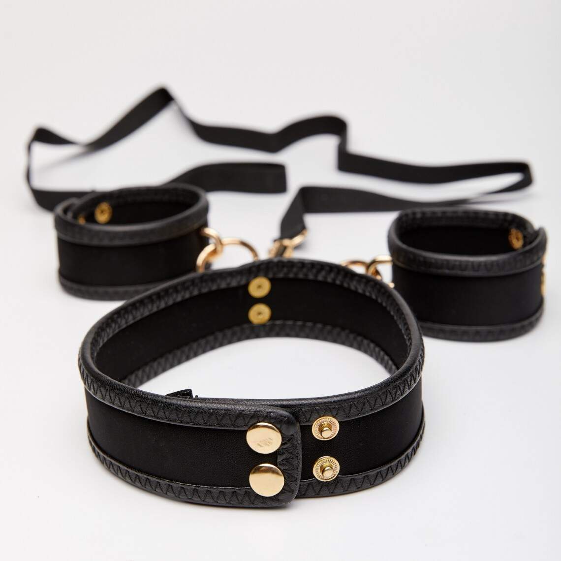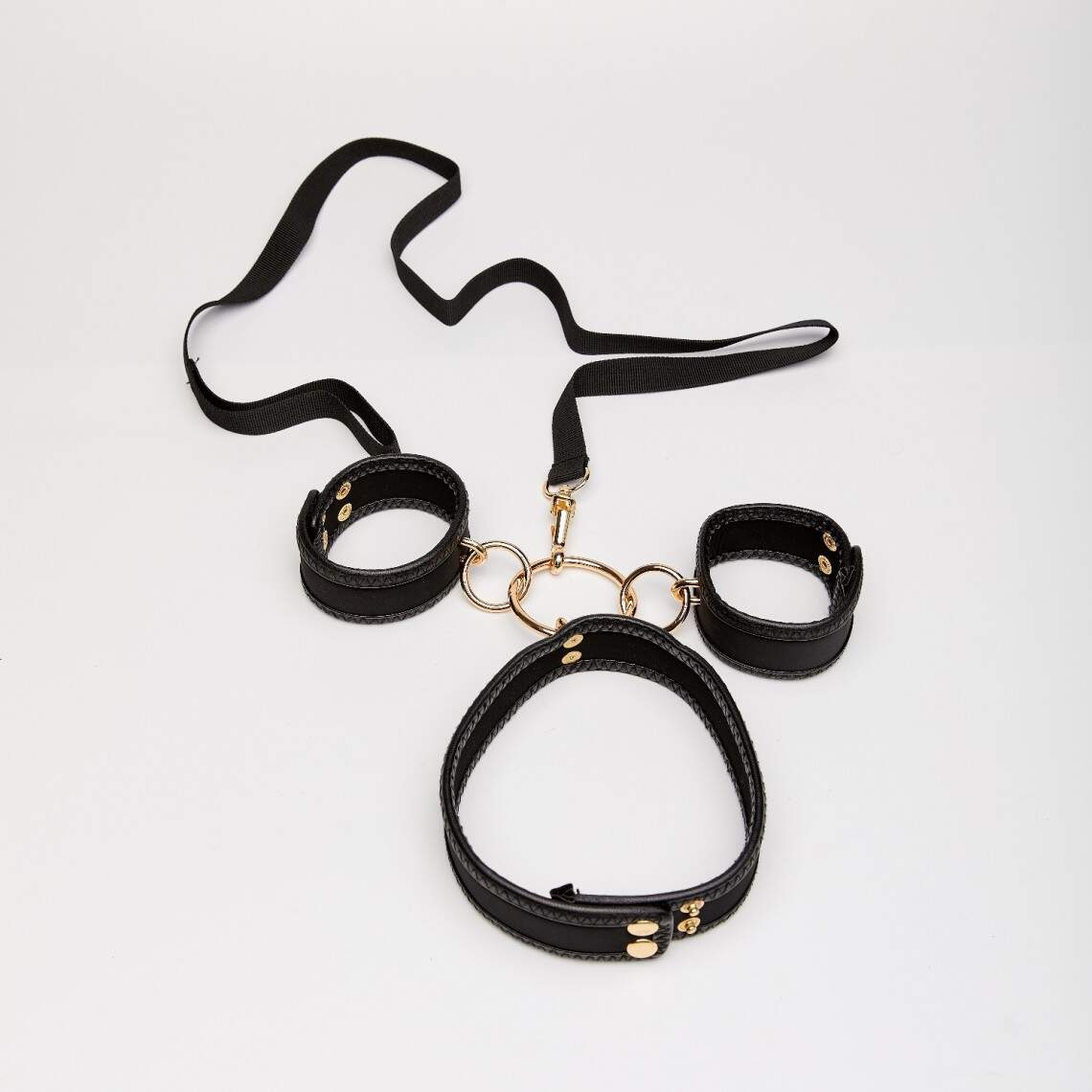 This set, consisting of handcuffs, a collar, and a leash, is designed for games of trust and control. The elements, made from black faux leather with golden-colored snap fasteners, highlight the luxurious aesthetic of submission. This is the perfect accessory for a deep exploration of desires and mutual pleasure.