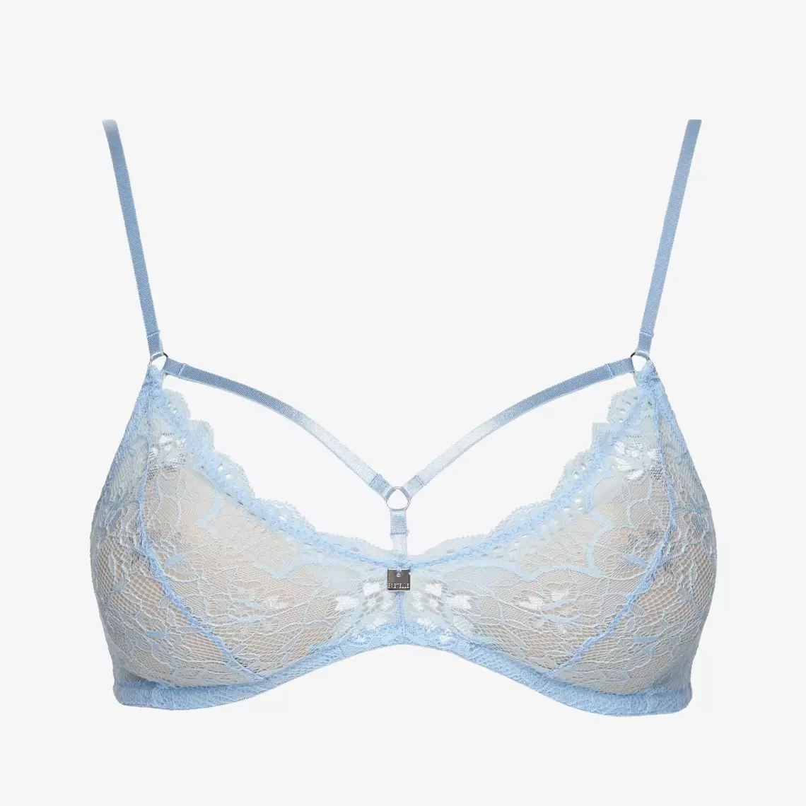 Sky blue wireless top. Made of lace. The cups are padded. Straps are adjustable. With a clasp on the back. 72% polyamide, 18% elastane, 8% viscose, 2% polyester.