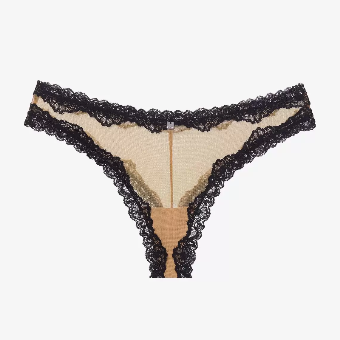 Elegant brazilians with a mid-rise fit in cappuccino color. Made from sheer mesh and decorated with black lace on the edges. 84% polyamide, 8% elastane, 8% cotton.