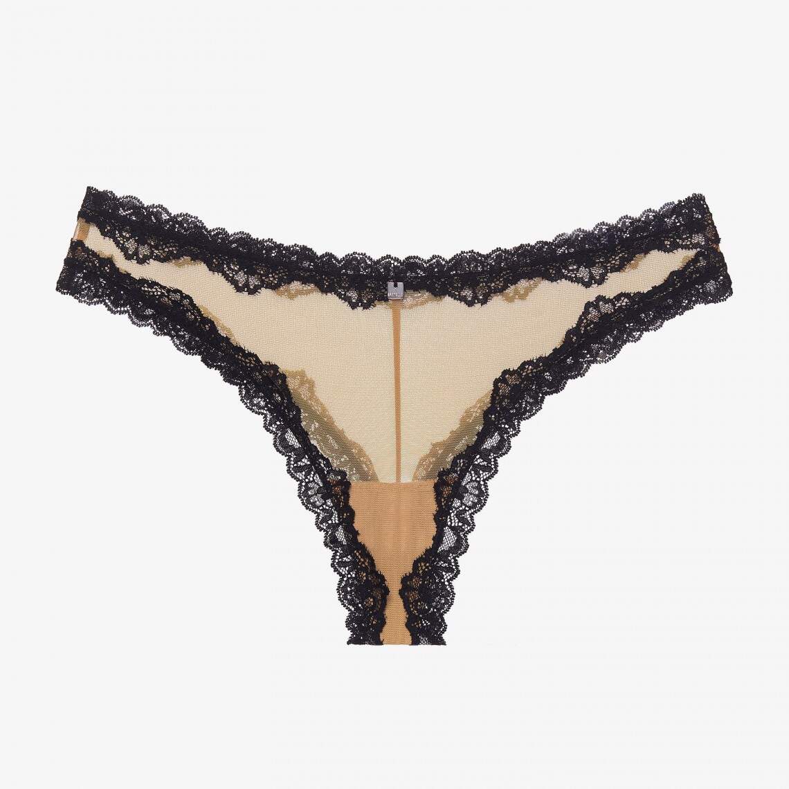 Elegant brazilians with a mid-rise fit in cappuccino color. Made from sheer mesh and decorated with black lace on the edges. 84% polyamide, 8% elastane, 8% cotton.
