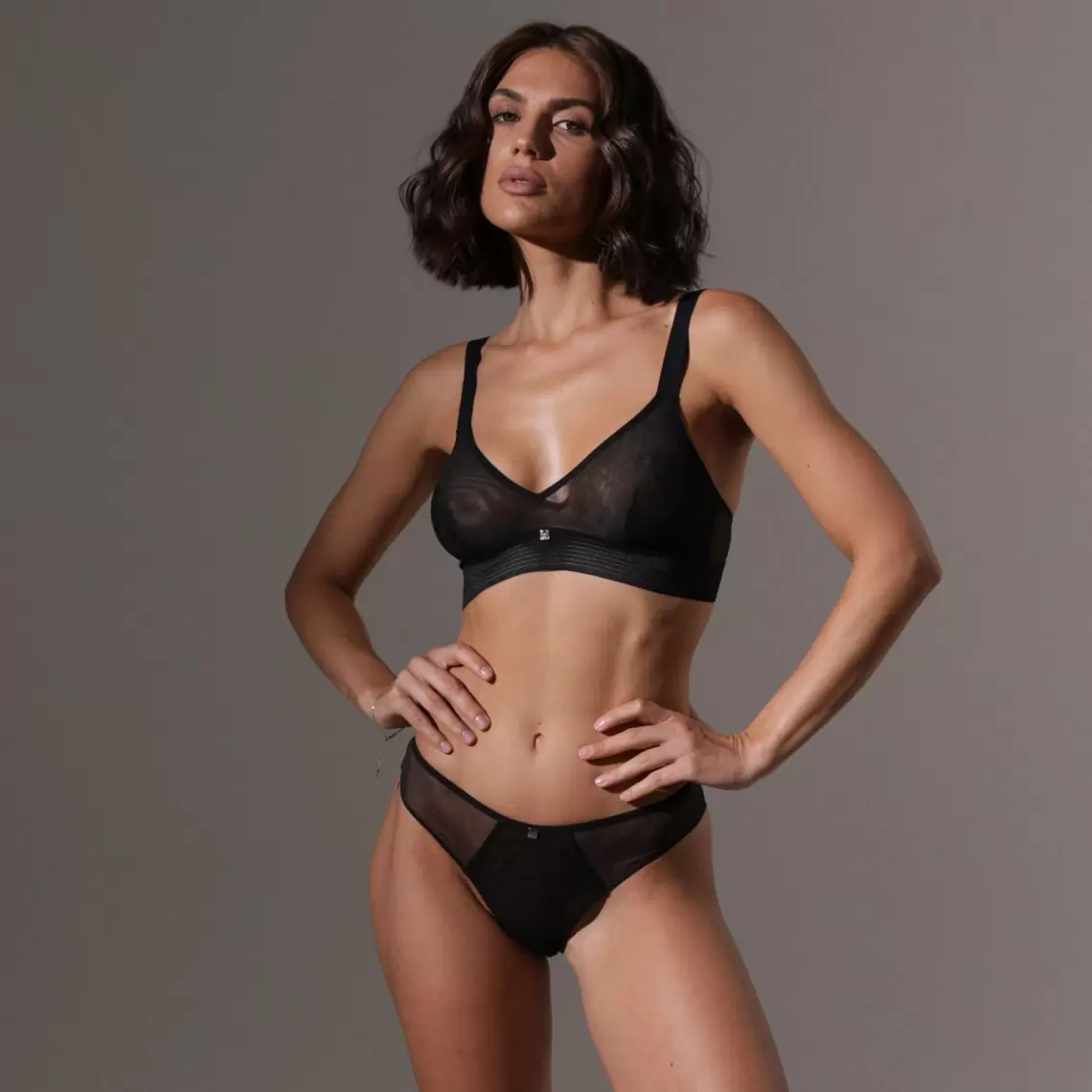 Black bralette without underwires. Made of mesh. Triangular cups are without foam inserts. Straps are adjustable. Polyamide 88%, elastane 12%.