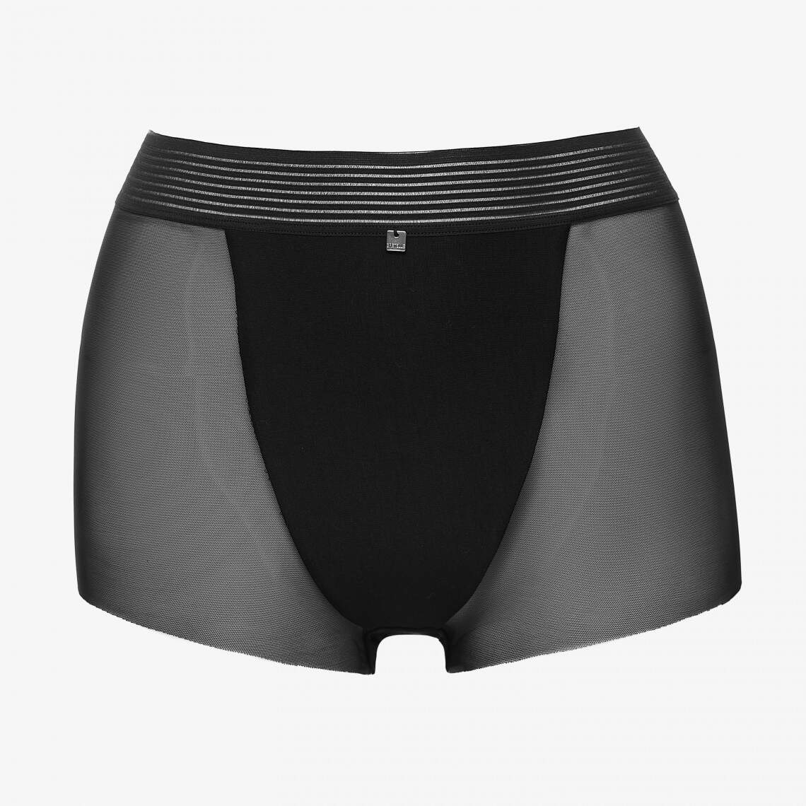 Shorts with a high rise fit. Made from mesh and cotton fabric of black color. With a wide elastic band on top. The gusset made of 100% cotton ensures intimate comfort. 84% polyamide, 8% elastane, 8% cotton.