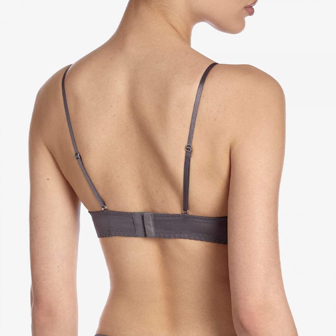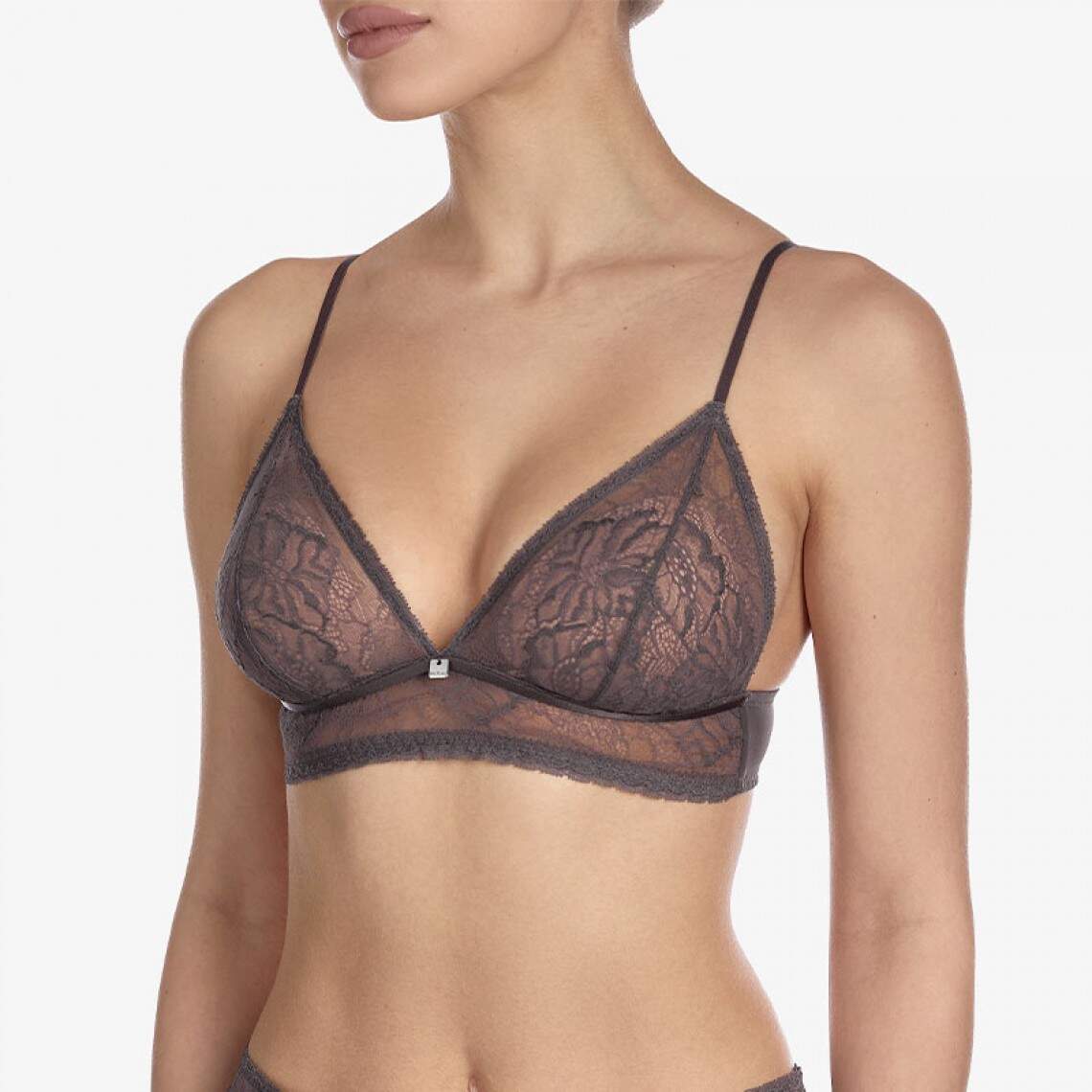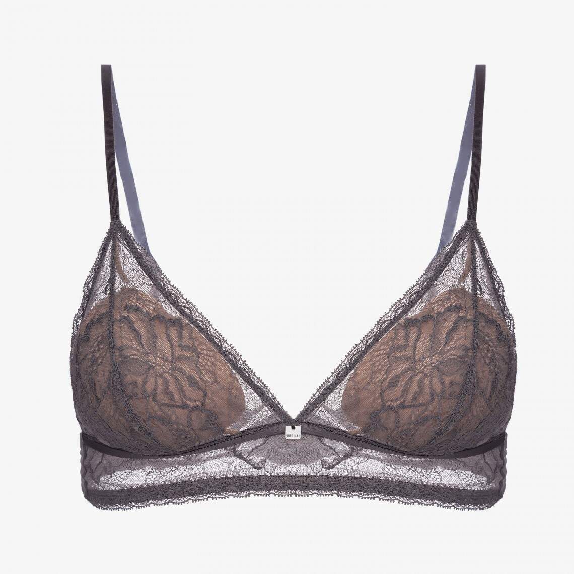 Anthracite wireless bralette. Made of lace and mesh. The cups are padded. Straps are adjustable. With a clasp on the back. 72% polyamide, 18% elastane, 8% viscose, 2% polyester.