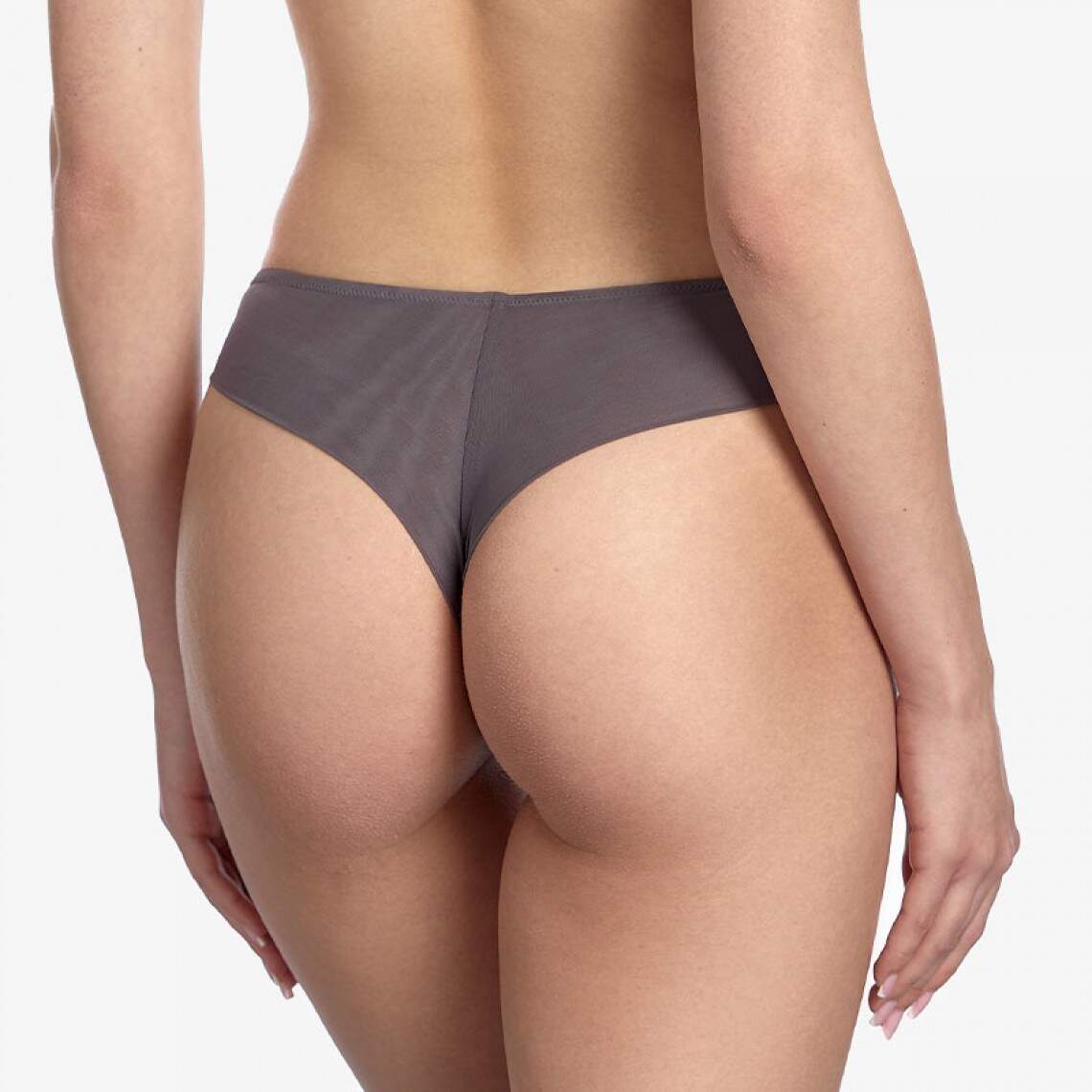 Бразилианы со средней посадкой антрацитового цвета. Спереди изготовлены из кружева, а сзади — из сетки. Ластовица из 100% хлопка. Полиамид 69%, эластан 16%, хлопок 8%, вискоза 6%, полиэстер 1%.