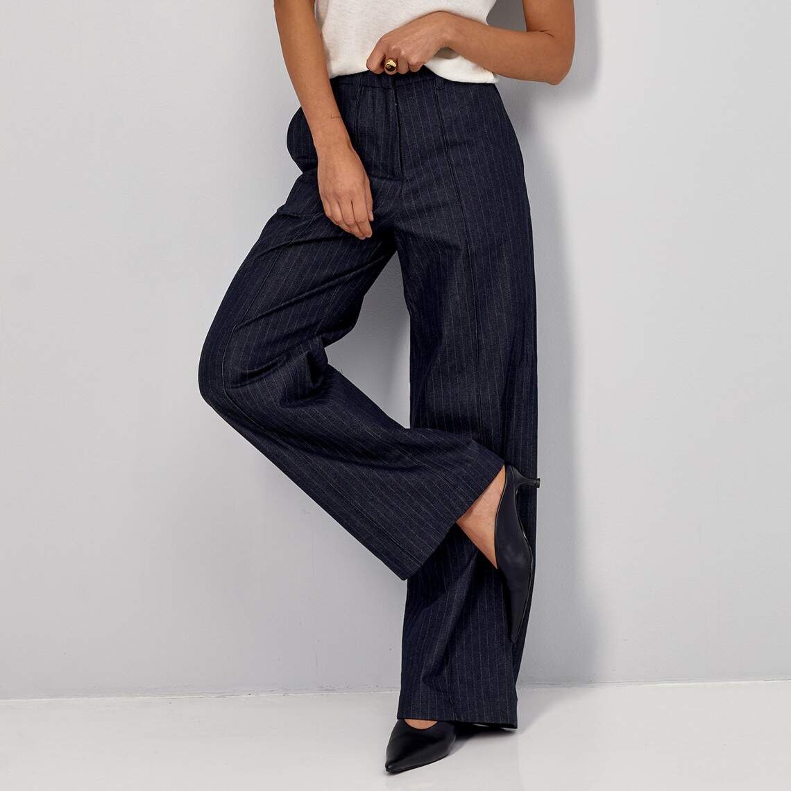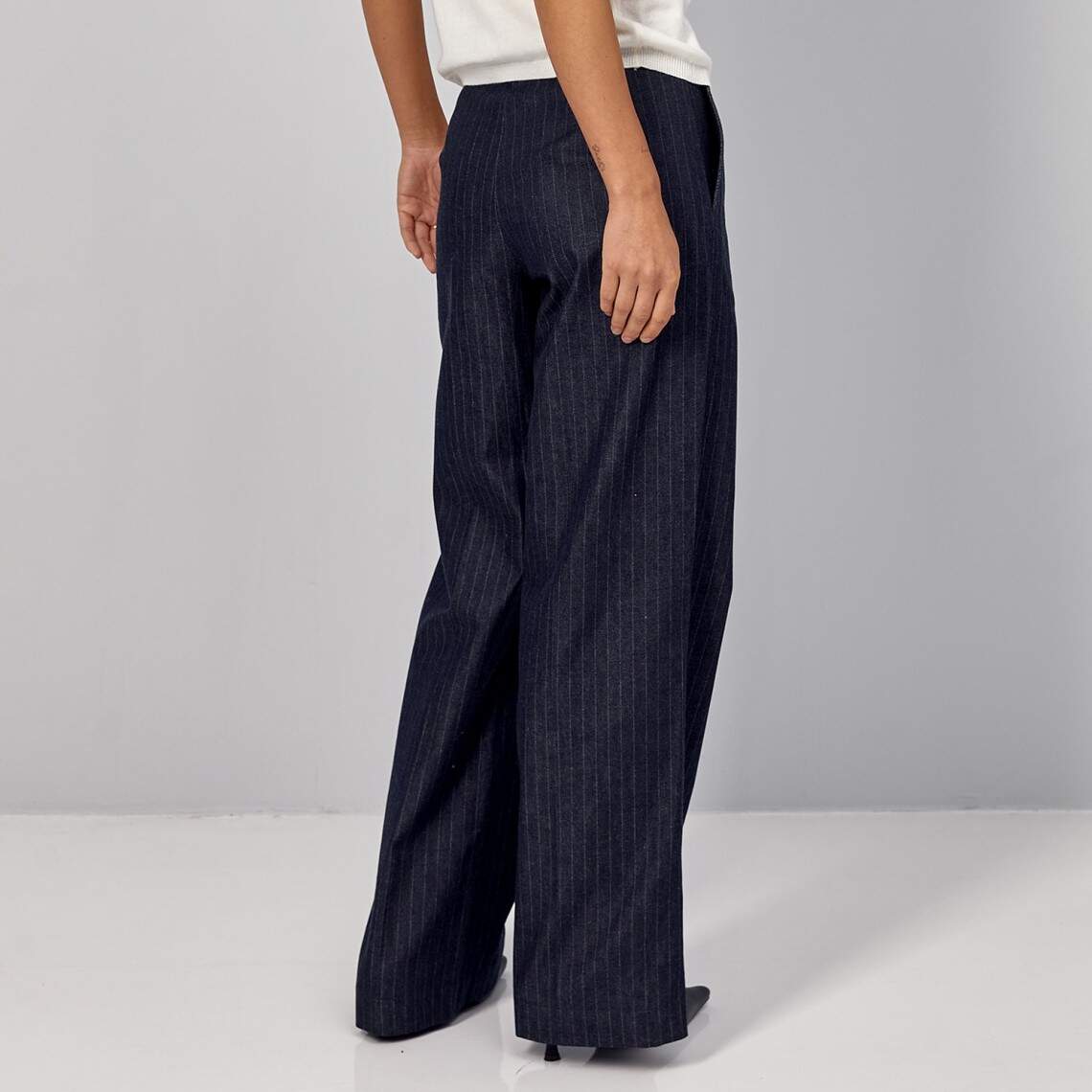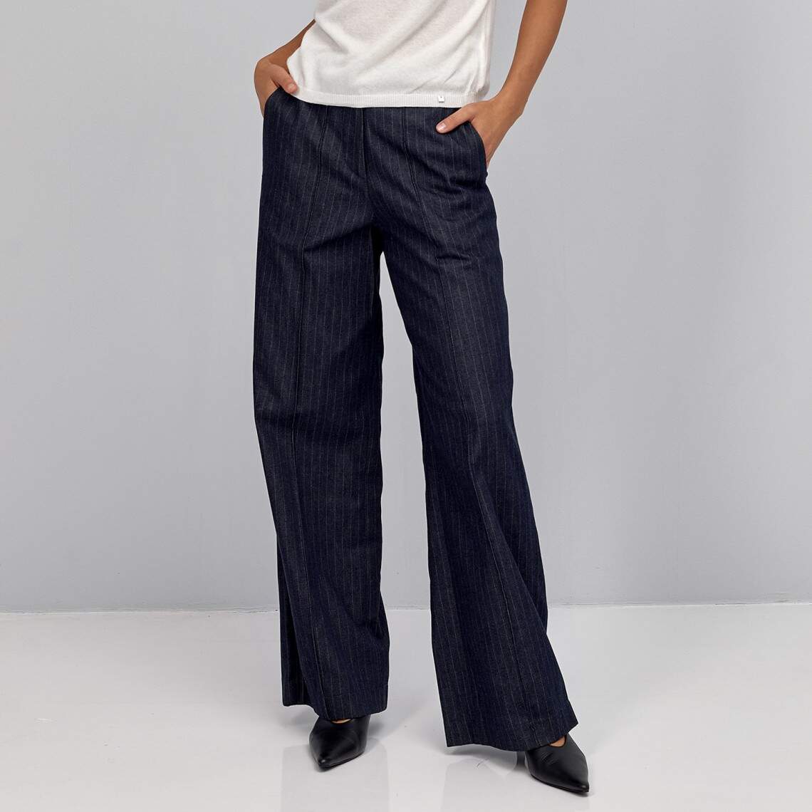 Women straight-cut pants with thin stripes. With arrows on the front. Made of blue cotton. With pockets, zipper and hooks. Maxi length. There is an elastic band on the back of the waist. 100% cotton.