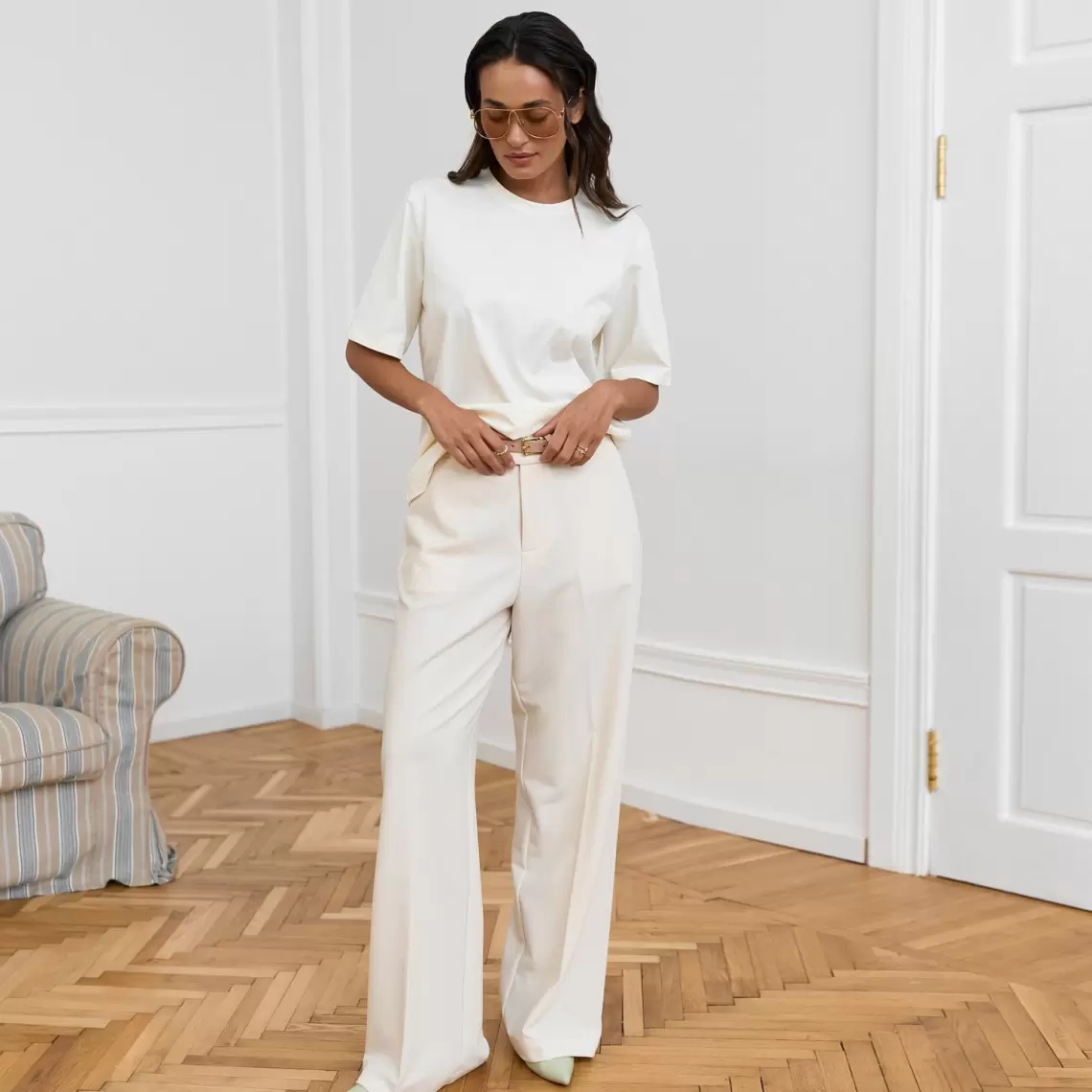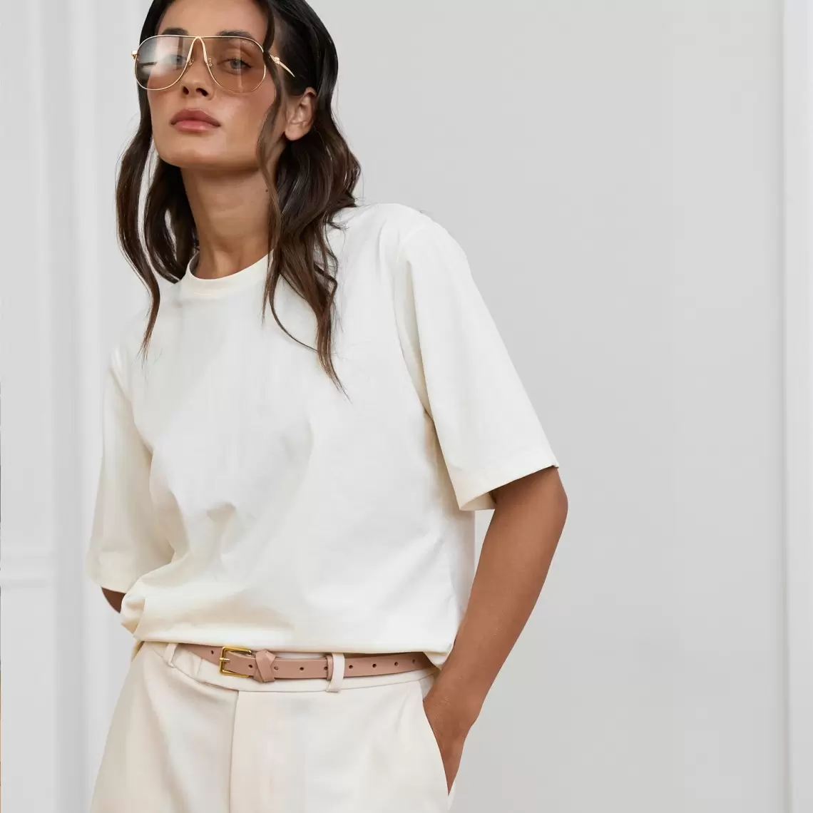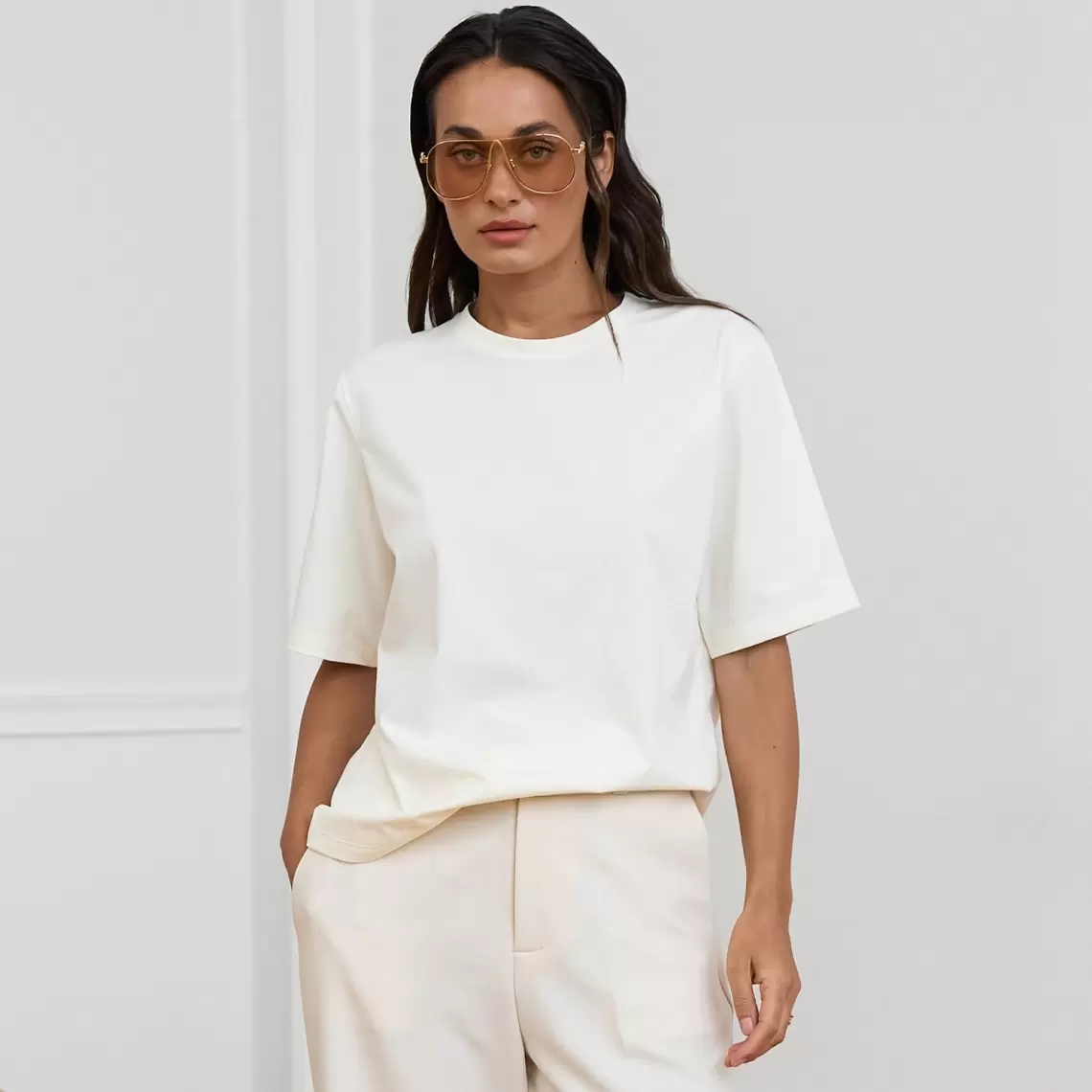 This universal milky T-shirt is an absolute must-have in every wardrobe. Made from cotton, it is soft to the touch, allows the skin to "breathe," and guarantees maximum comfort even on the hottest days. The model features a relaxed fit that does not restrict movement, a classic round neckline, and standard sleeve length. The T-shirt easily fits into any look: from a sporty aesthetic with joggers to an elegant outfit under a jacket or cardigan. It can be worn loose or tucked into jeans, skirts, or shorts. This is a flawless basic that combines practicality, natural materials, and a modern everyday style. Composition: cotton 80%, polyester 20%.