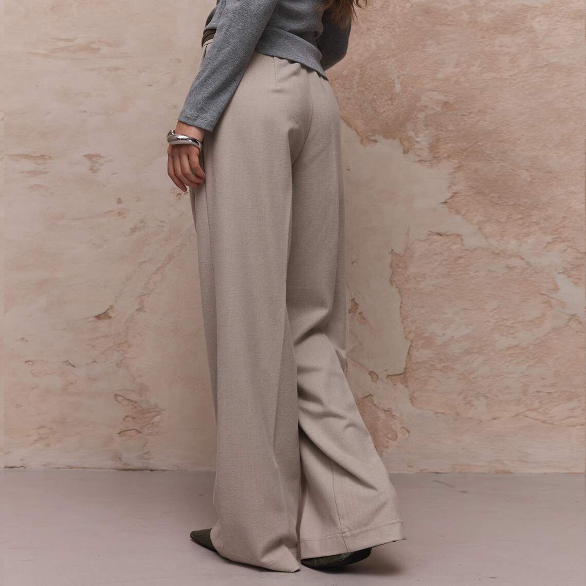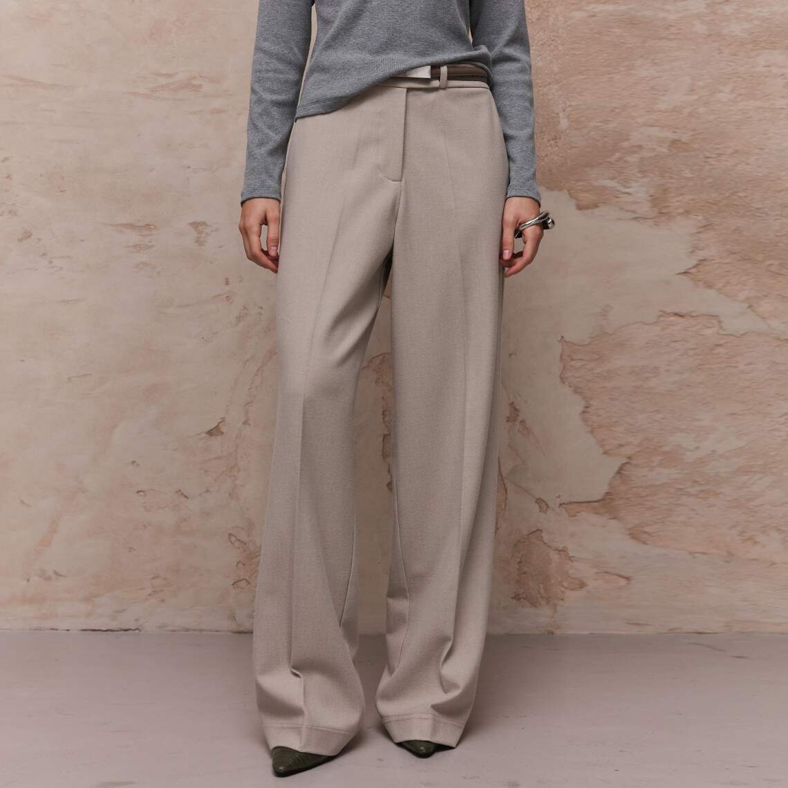 Women's straight-leg pants. Maxi length. With zipper and button. Color: taupe. Polyester 62%, viscose 24%, wool 10%, spandex 4%.