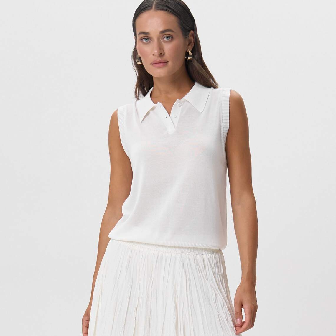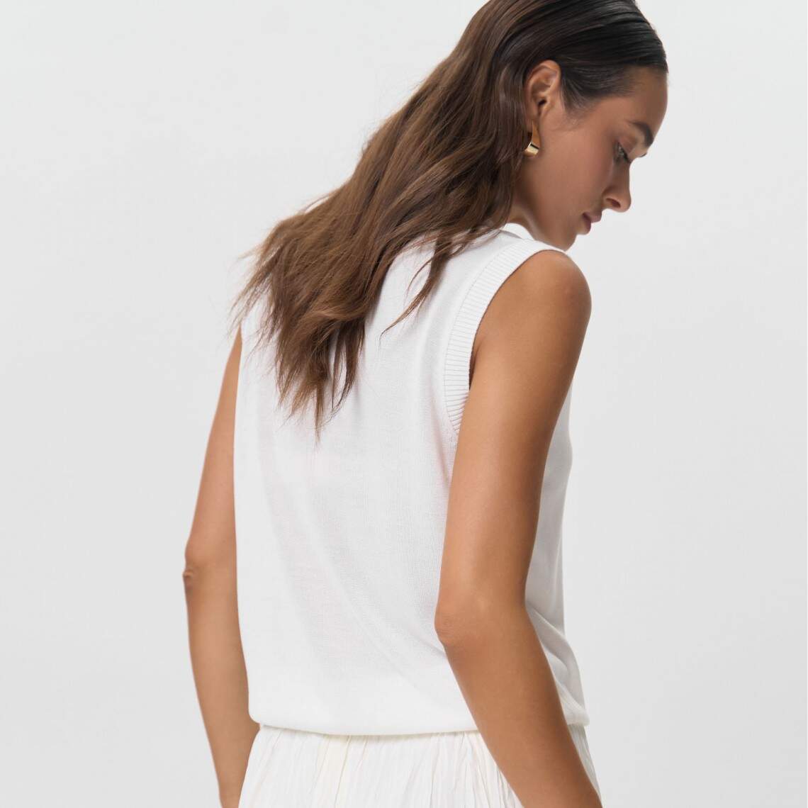 Sleeveless blouse. Made from soft knitted fabric. With a polo collar and buttons. It will complement your autumn wardrobe and become an integral part of autumn outfits. Composition: 100% Tencel.