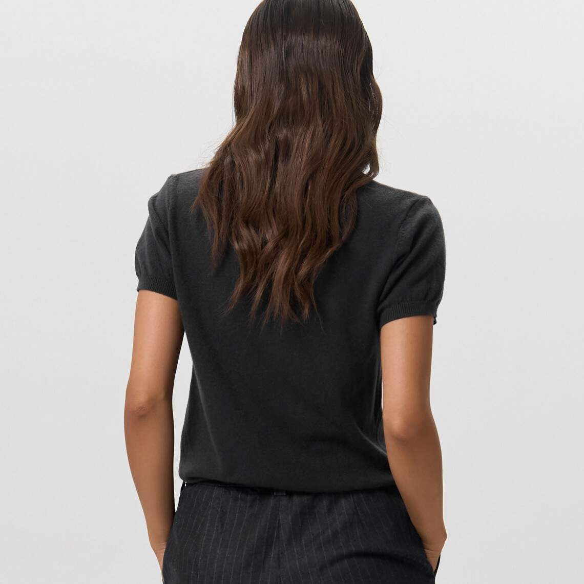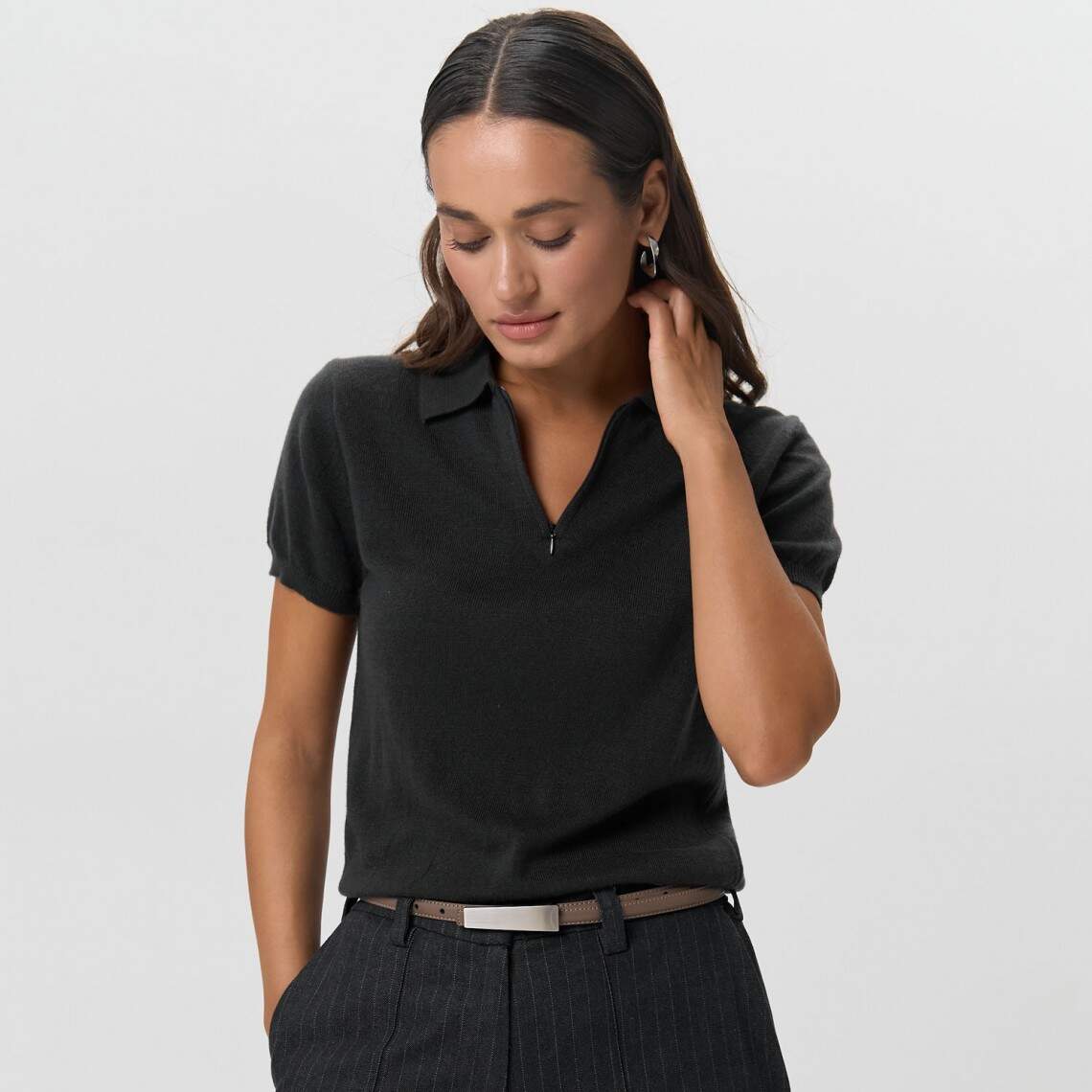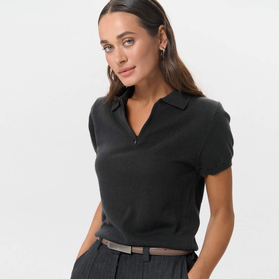 Short-sleeved T-shirt. Made from a soft knitted fabric. With a polo collar and a zipper closure. It pairs wonderfully with various skirts, trousers, and shorts, creating relevant autumn outfits. Composition: 50% acrylic, 45% nylon, 5% wool.