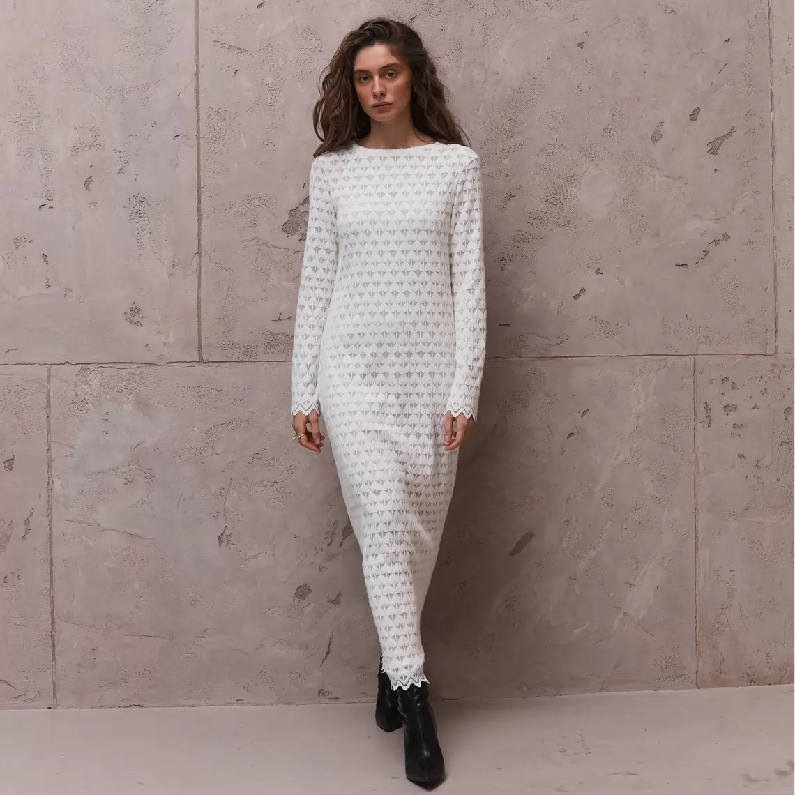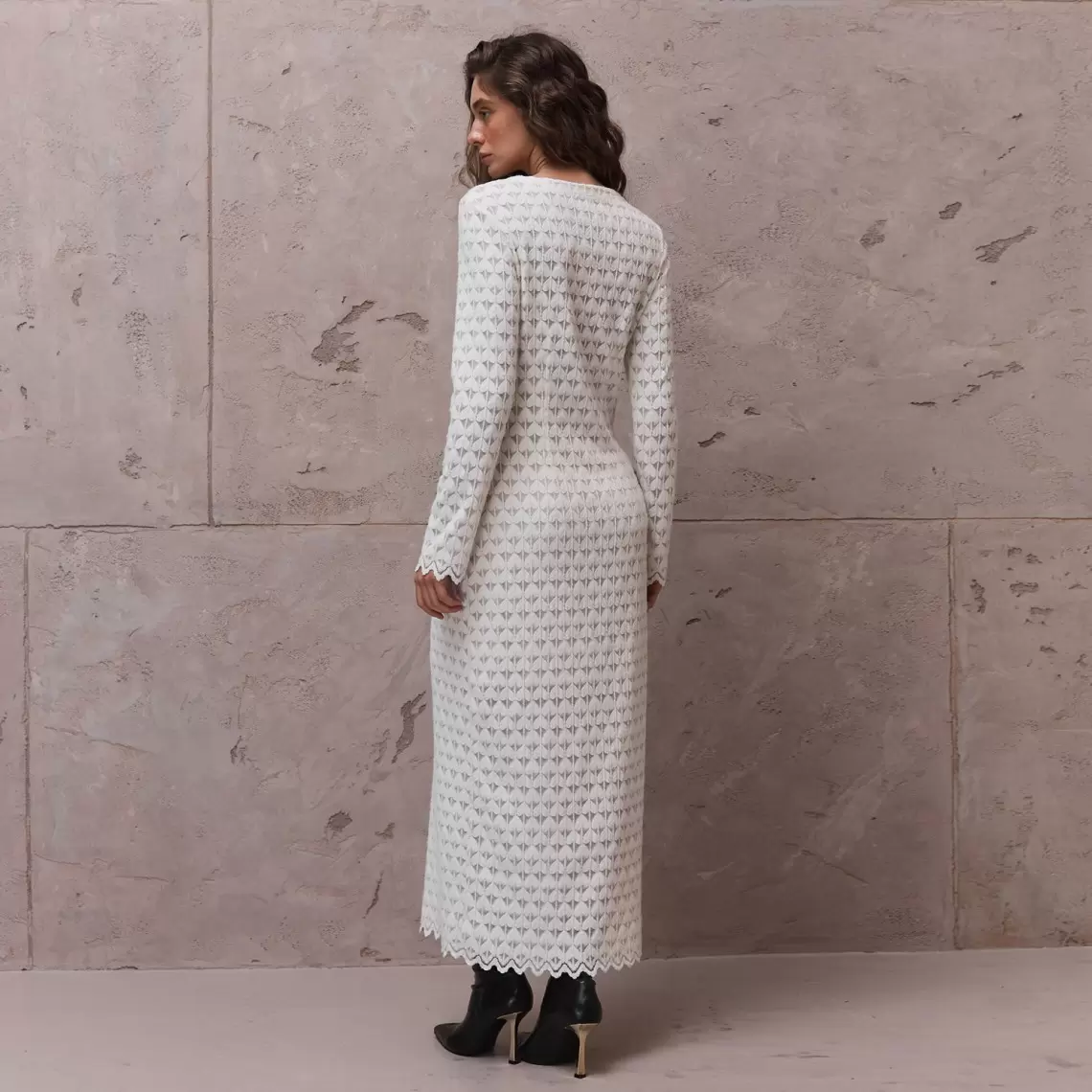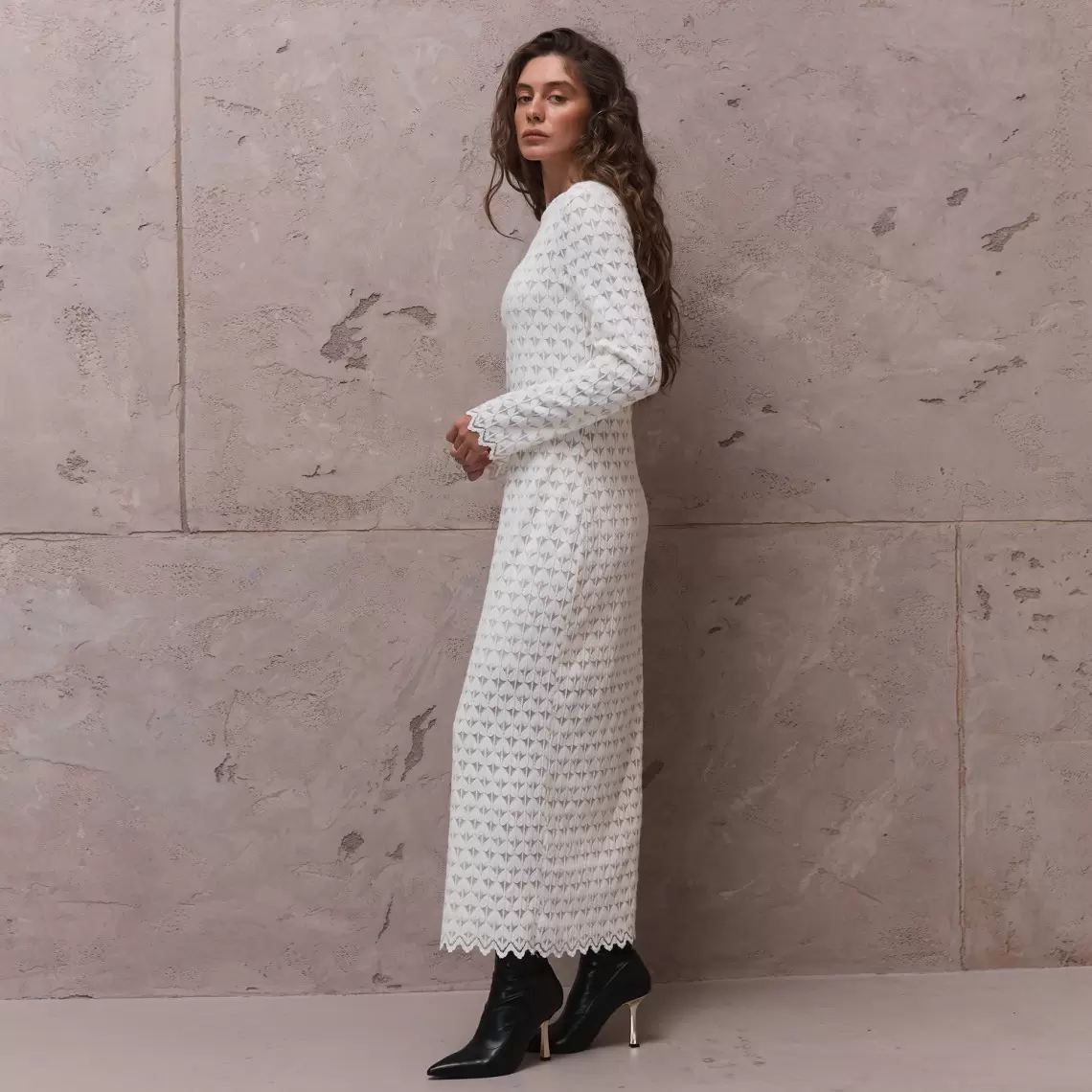 Exquisite milk-colored dress with long sleeves. Made of soft jersey fabric with a heart pattern. Maxi length. Nylon 90%, spandex 10%.
