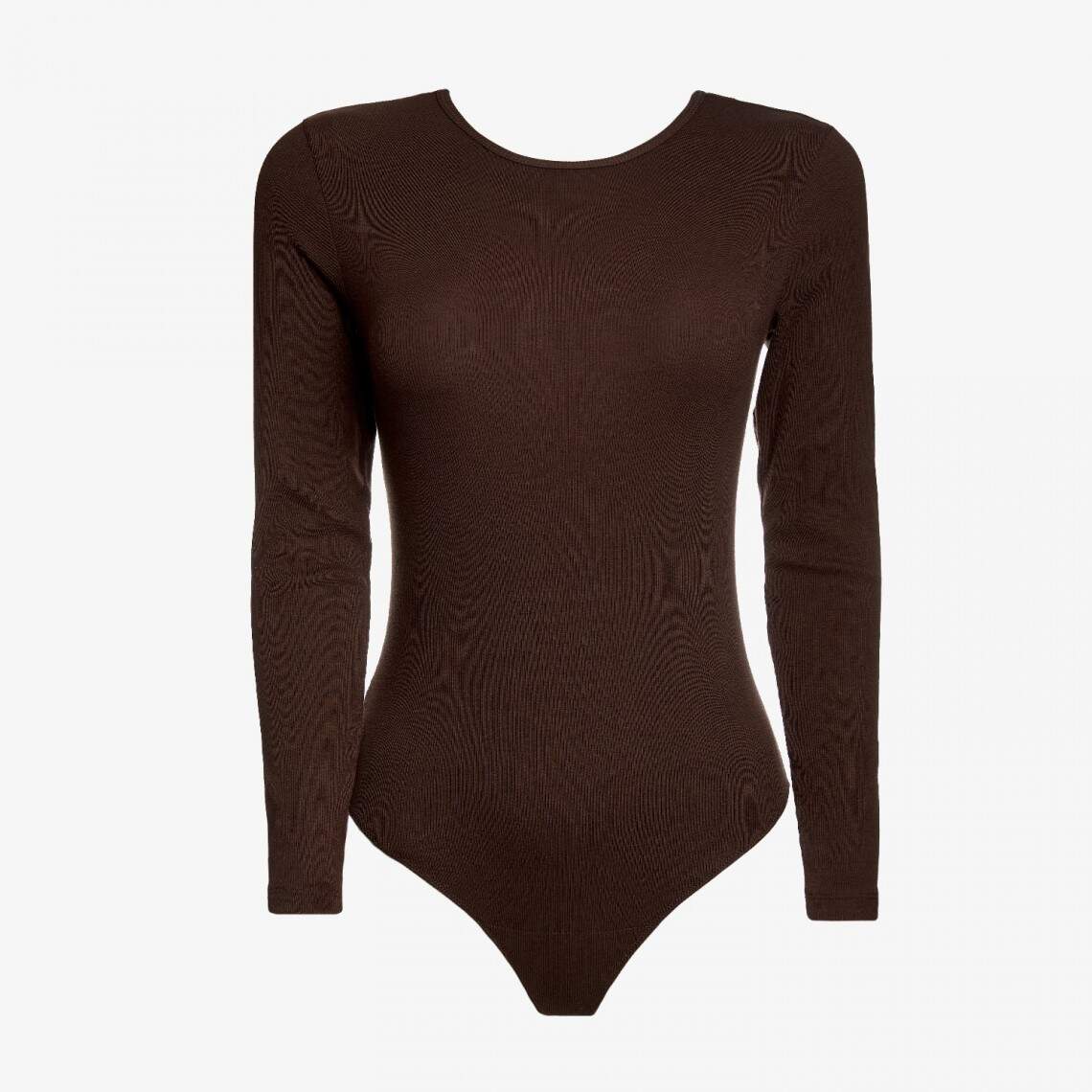 Basic bodysuit in chocolate color with long sleeves. With a round neck. Without foam and bones. Made of soft knitted fabric. There is a classic fastener above the gusset. Viscose 66%, nylon 26%, cotton 8%.