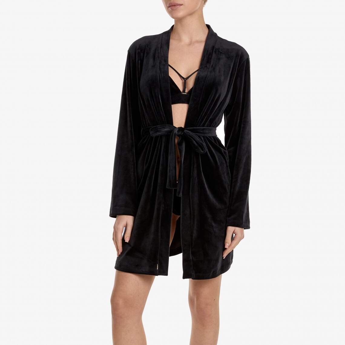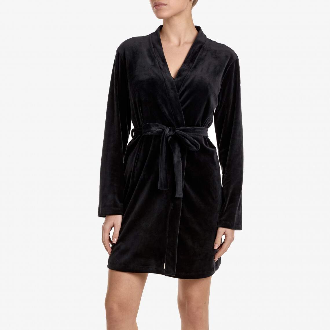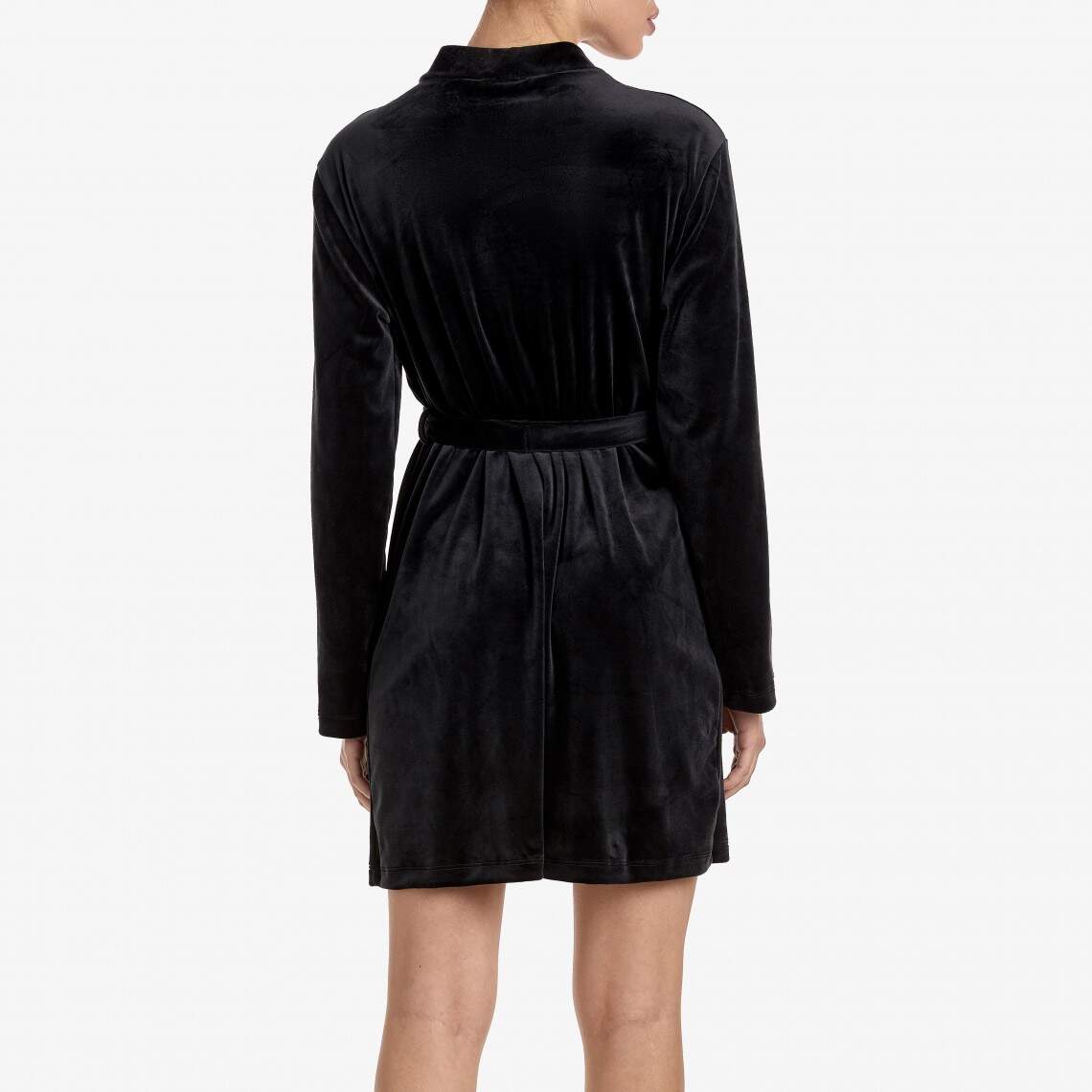 Feel the touch of luxury and comfort at home. This loose-fitting robe is crafted from soft black velvet that drapes beautifully over the body. The knee length and long sleeves add elegance to the look, and a tie belt allows you to accentuate the waist. This model is the perfect addition to your home wardrobe. Composition: Polyamide 92%, Elastane 8%