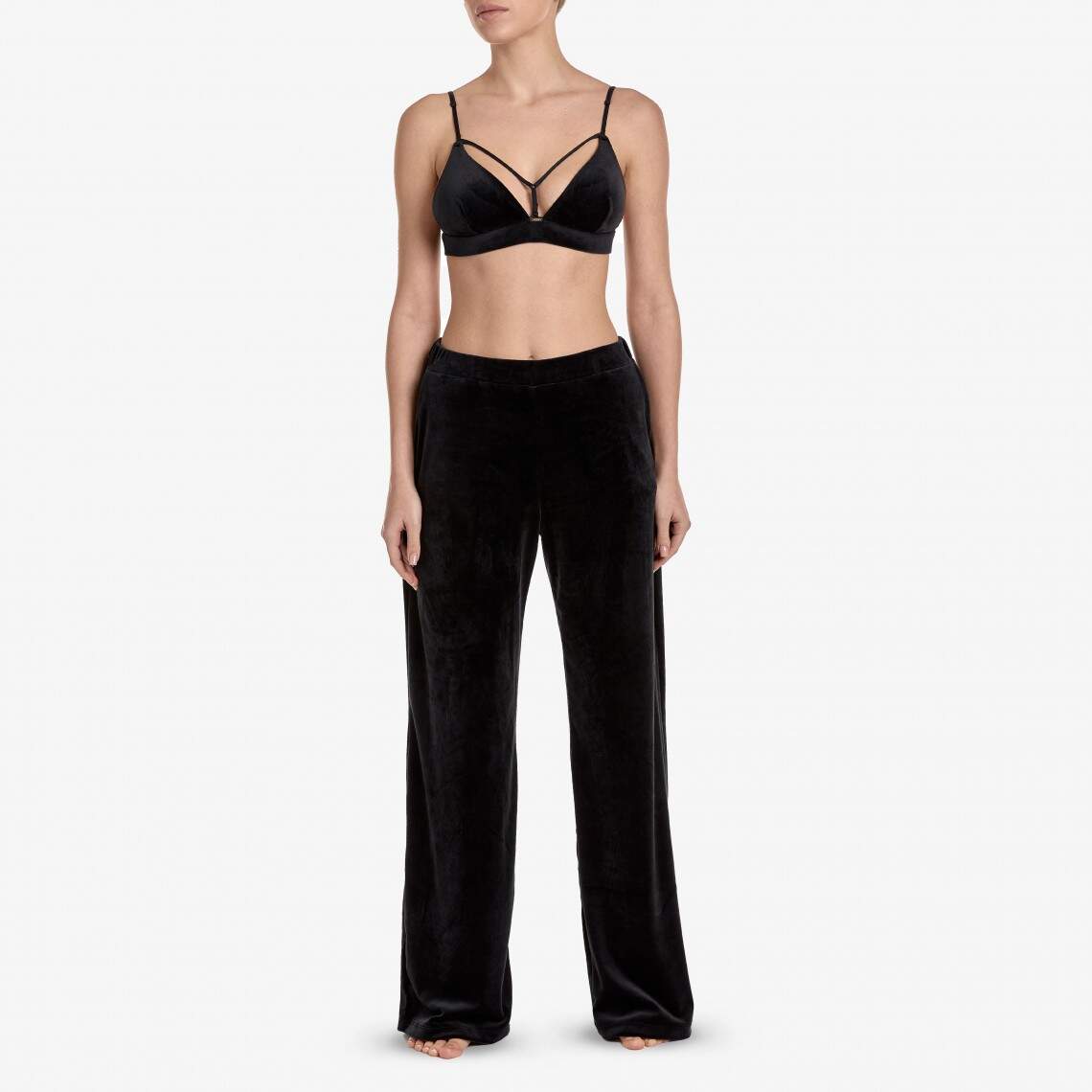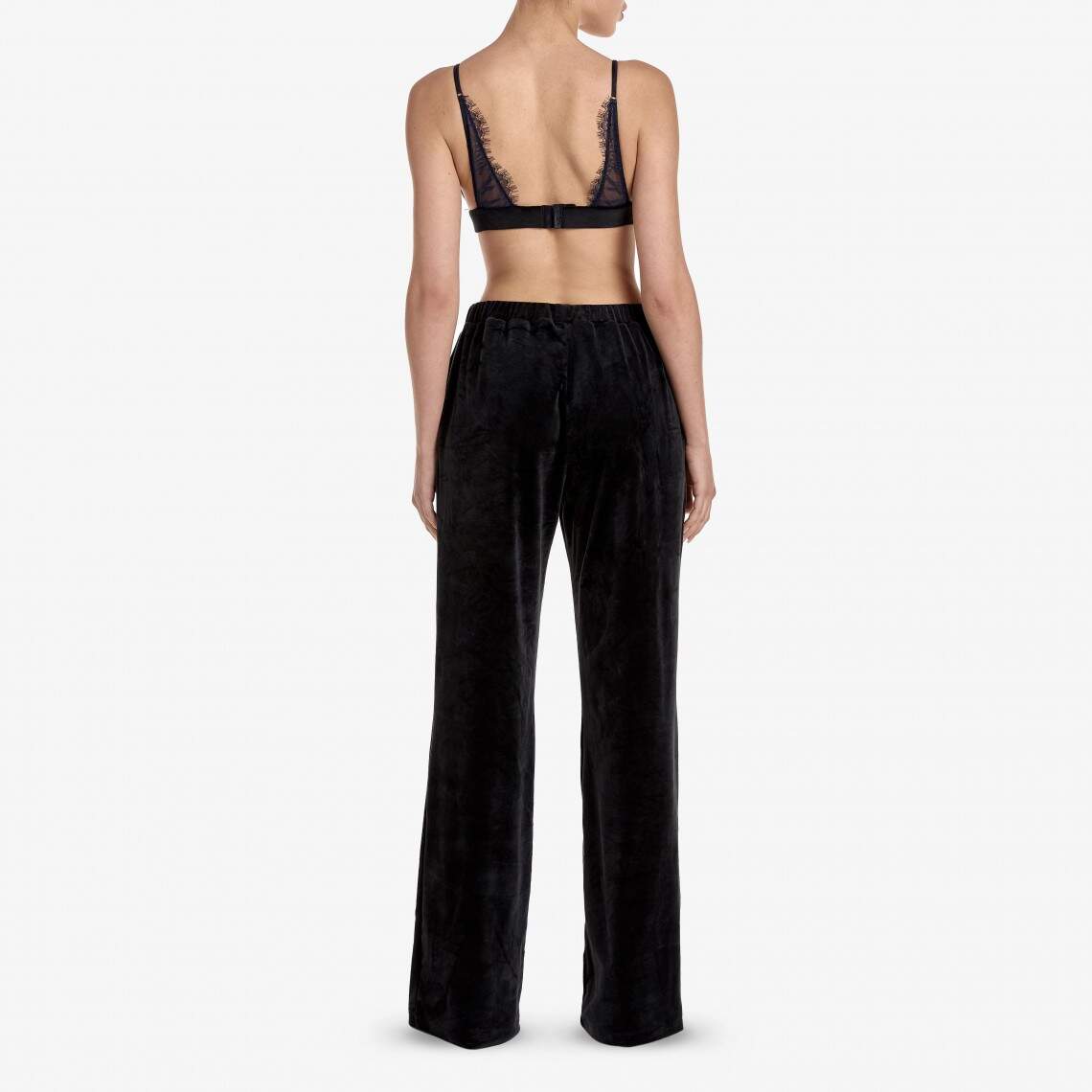 These loungewear pants are the embodiment of coziness and style. Crafted from soft black velvet, they feature a straight, maxi-length cut and a comfortable elastic waistband. Thanks to the pockets, this model is not only elegant but also practical. Composition: Polyamide 92%, Elastane 8%