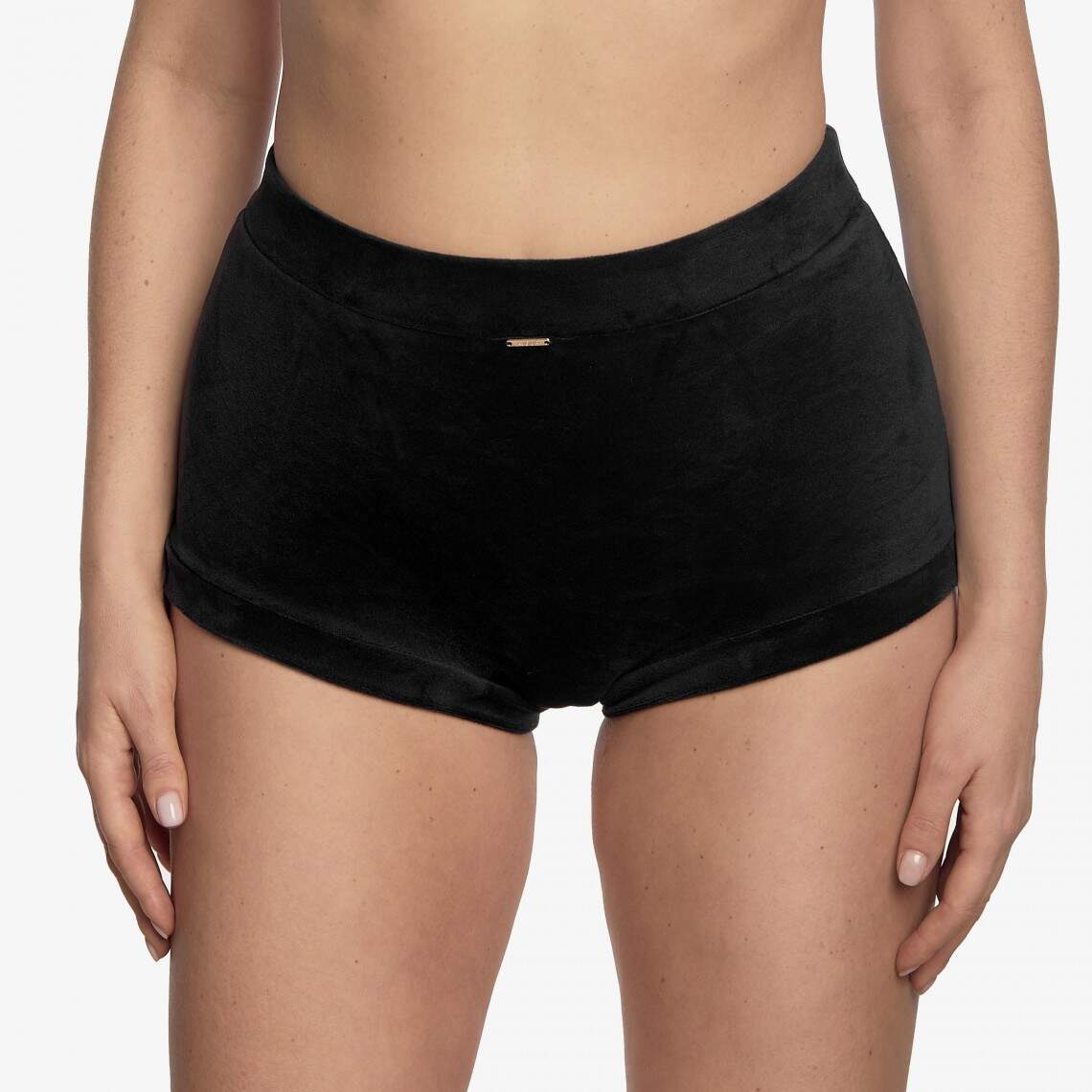 These elegant shorts are the perfect choice for a loungewear look that accentuates the figure. Crafted from soft black velvet, they feature a mid-rise and a fitted cut that beautifully highlights your natural curves. The mini length and comfortable elastic waistband ensure both comfort and style. Composition: Polyamide 92%, Elastane 8%