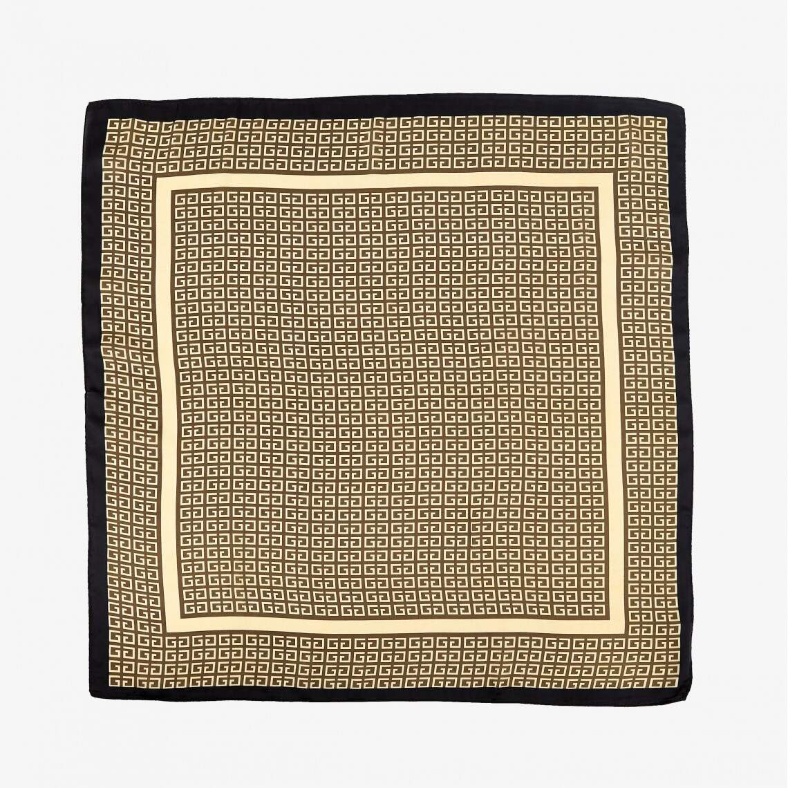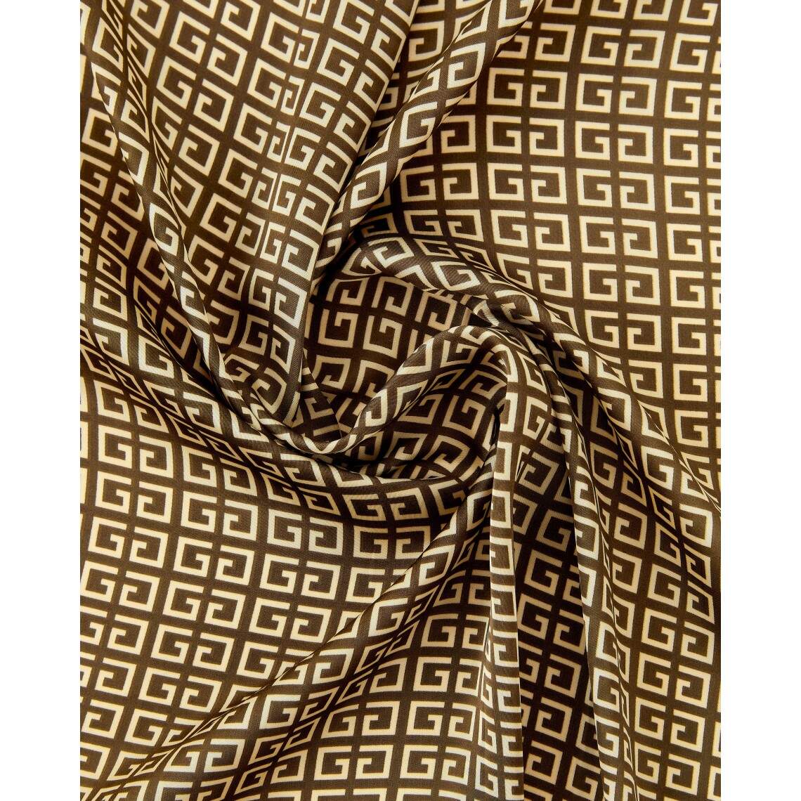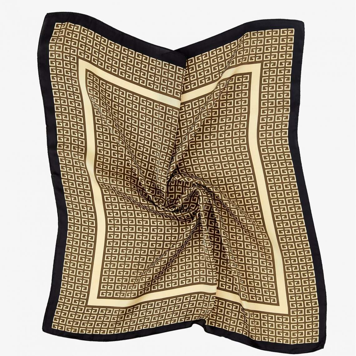 This kerchief is the embodiment of understated luxury and modern minimalism. Thanks to its sharp geometric print, it looks expensive and trend-forward, effortlessly complementing both a business wardrobe and everyday looks. The print features repeating geometric labyrinths, reminiscent of the iconic ornaments found in the collections of world-renowned fashion houses. The 70 × 70 cm size is the optimal format for a classic neck tie or for use as a stylish headband. Made from 100% polyester, the fabric boasts a silky texture that shimmers beautifully in the light, is practically wrinkle-free, and is characterized by high durability.