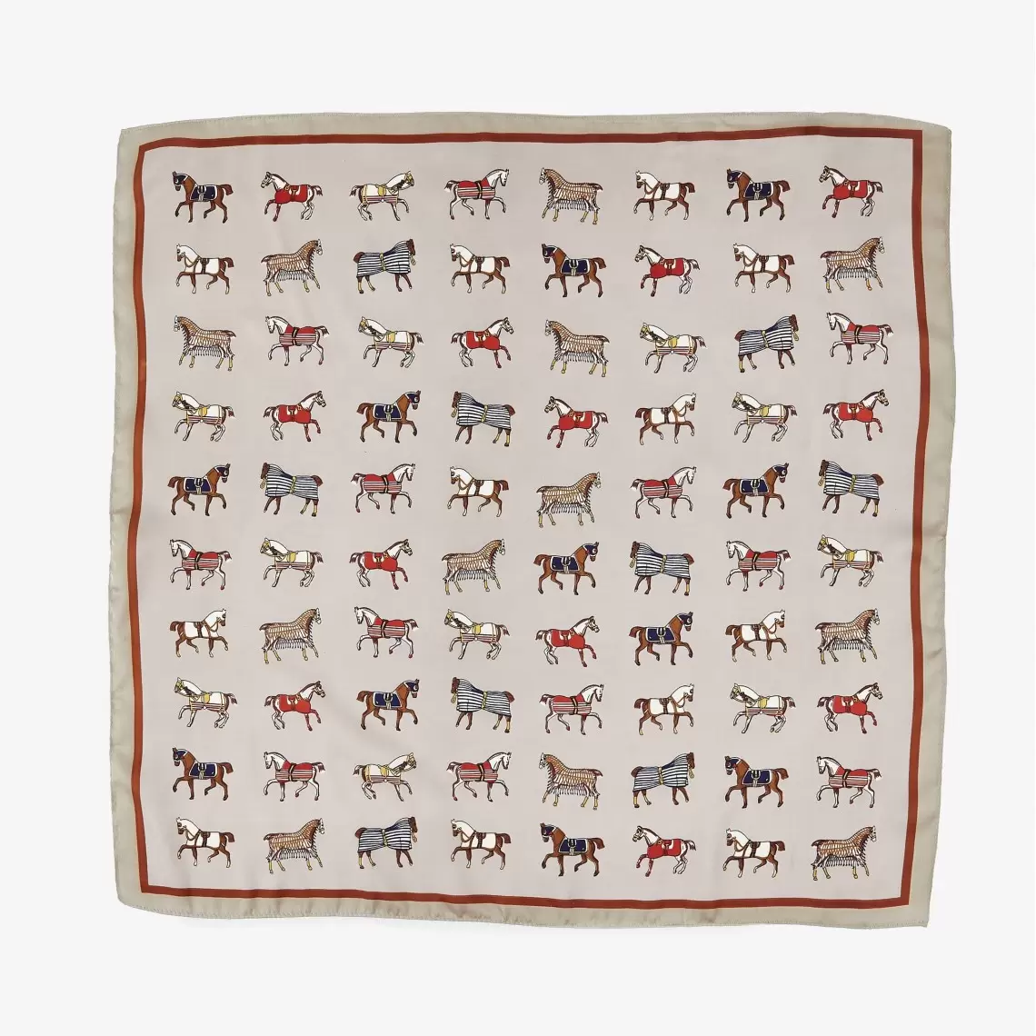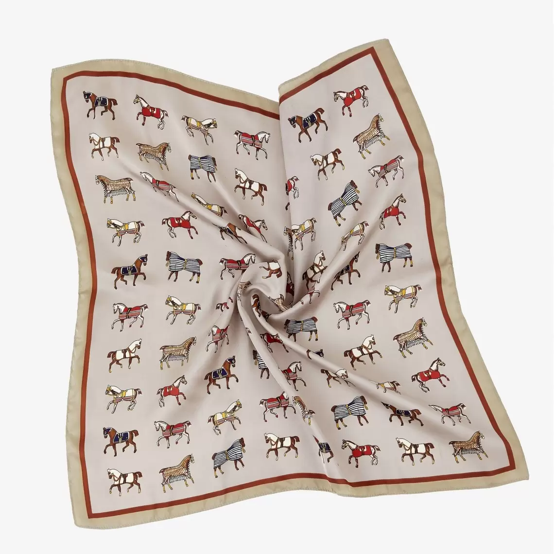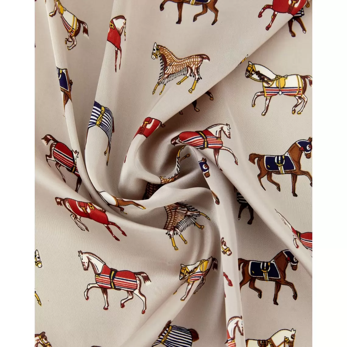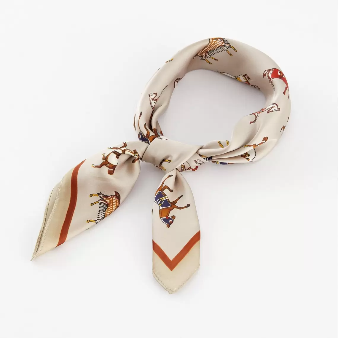 This kerchief is crafted in a sophisticated equestrian style, blending aristocratic restraint with a dynamic pattern. Thanks to its warm beige palette, it looks soft and elegant. Wear it gracefully around your neck, as a stylish headband, or fastened to a bag handle to create a refined accent. The 70 × 70 cm size is a universal format, perfect for creating voluminous knots or sleek, graceful lines. Made from 100% polyester, the fabric features a silky texture with a subtle, noble sheen; it is durable and exceptionally pleasant to the touch.