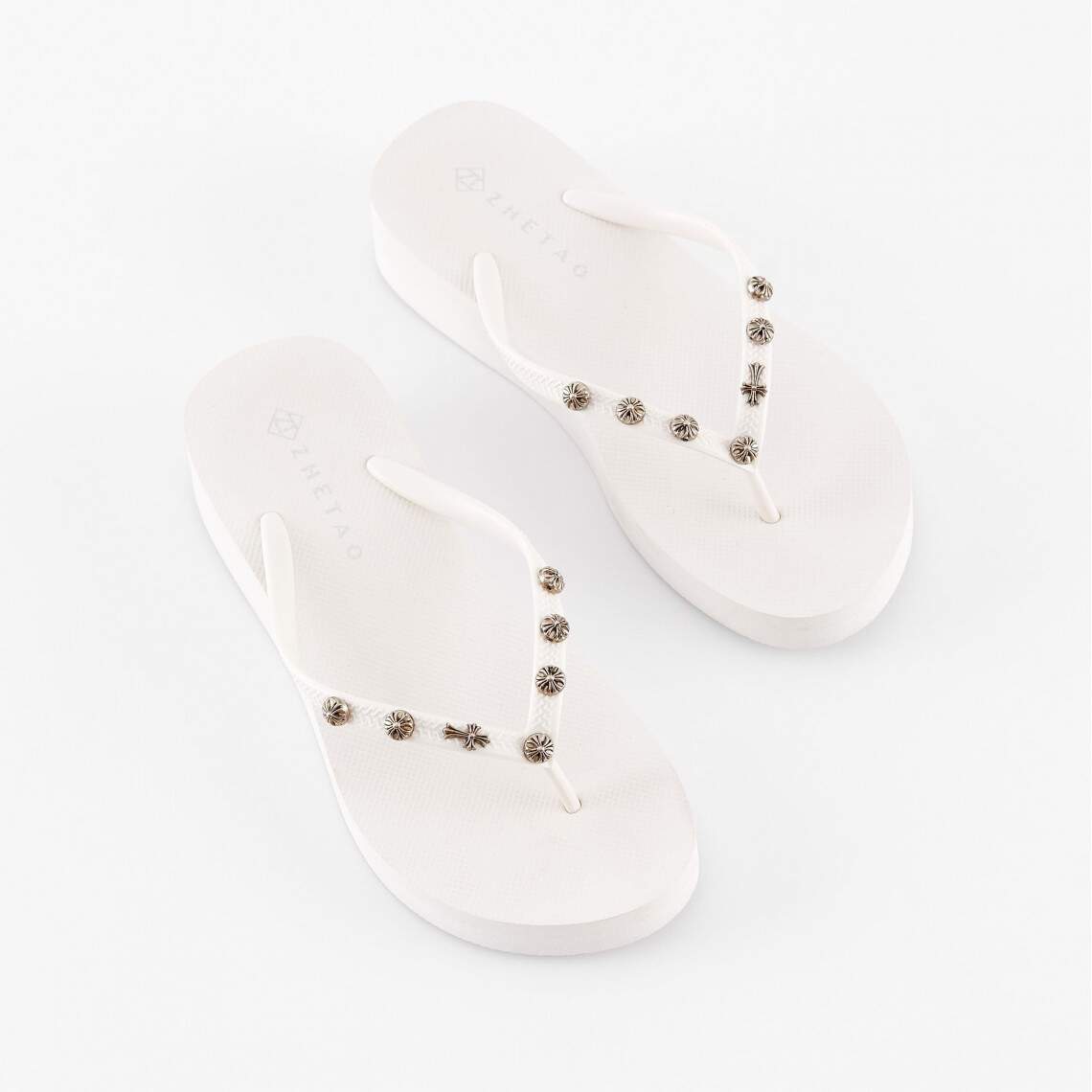 Women's White Flip-Flops Adorned with Metal Charms