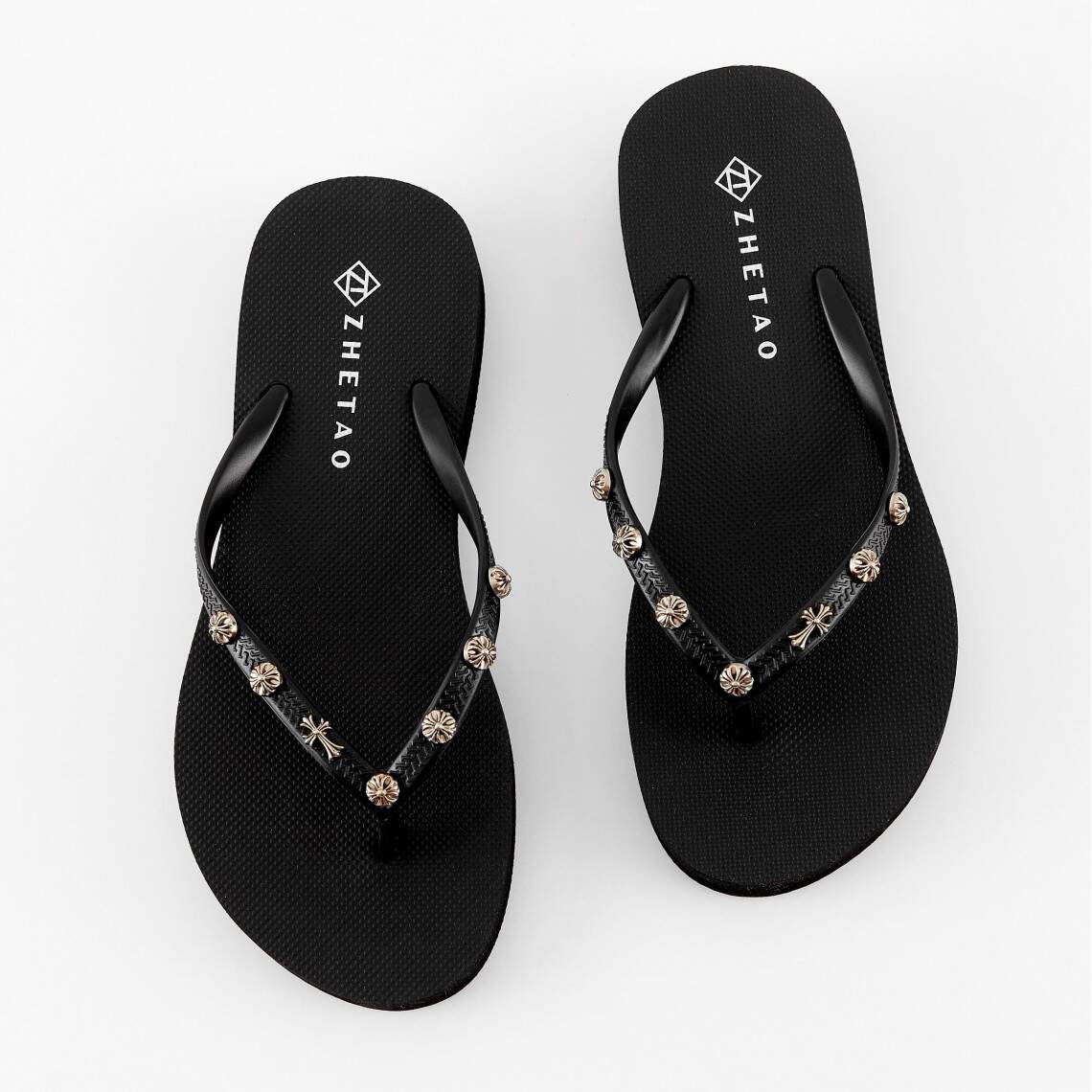 Women's Black Flip-Flops Adorned with Metal Charms