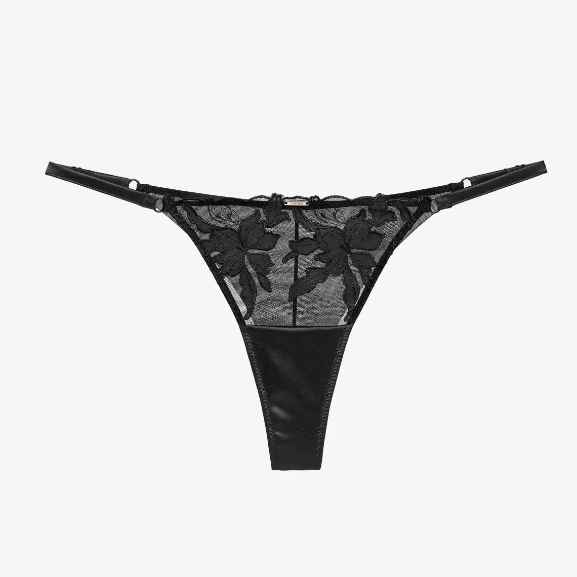 Low-rise thongs designed to emphasize the sophistication and sensuality of your silhouette. This model is crafted from semi-sheer mesh and decorated with exquisite floral appliques made of smooth satin, which gives the look a romantic charm. The thin adjustable waistband allows for a perfect, personalized fit. A cotton gusset ensures a feeling of freshness and maximum comfort throughout the day. Composition: Polyamide 69%, Elastane 16%, Viscose 6%, Polyester 1%, Cotton 8%¶