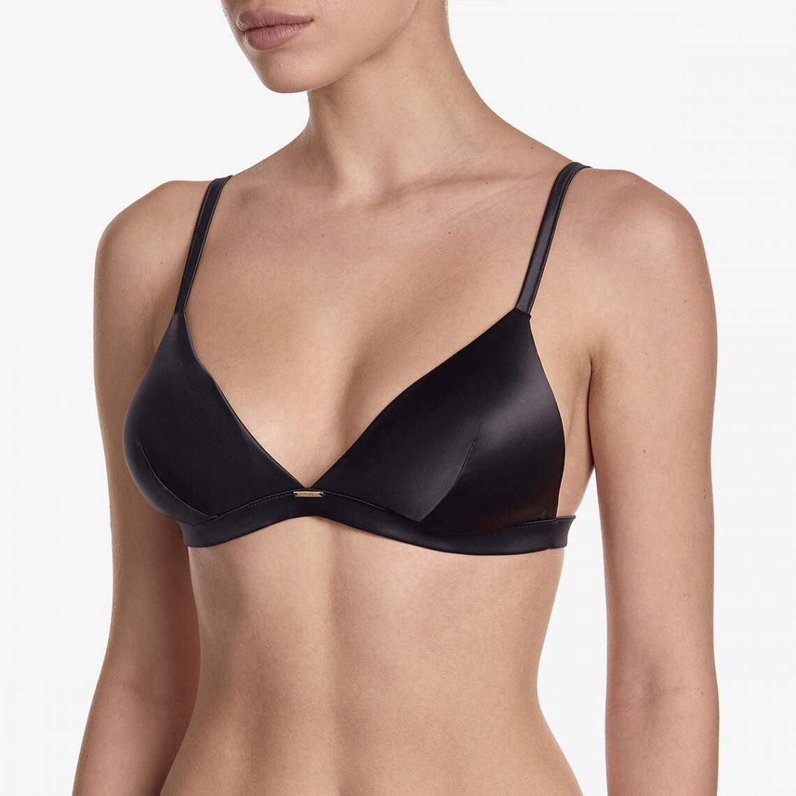 A bralette that combines refined elegance with weightless comfort. Crafted from seamless satin in a deep black color, it provides a feeling of luxurious smoothness. Thanks to its wireless design and delicate inserts in the cups, it ensures a perfect shape. This model is the ideal base for creating both everyday and evening looks. Feel free to pair it with a loosely draped shirt or an elegant jacket to demonstrate your impeccable style. Composition: Polyester 92%, Elastane 8%