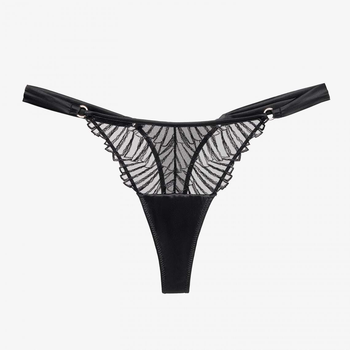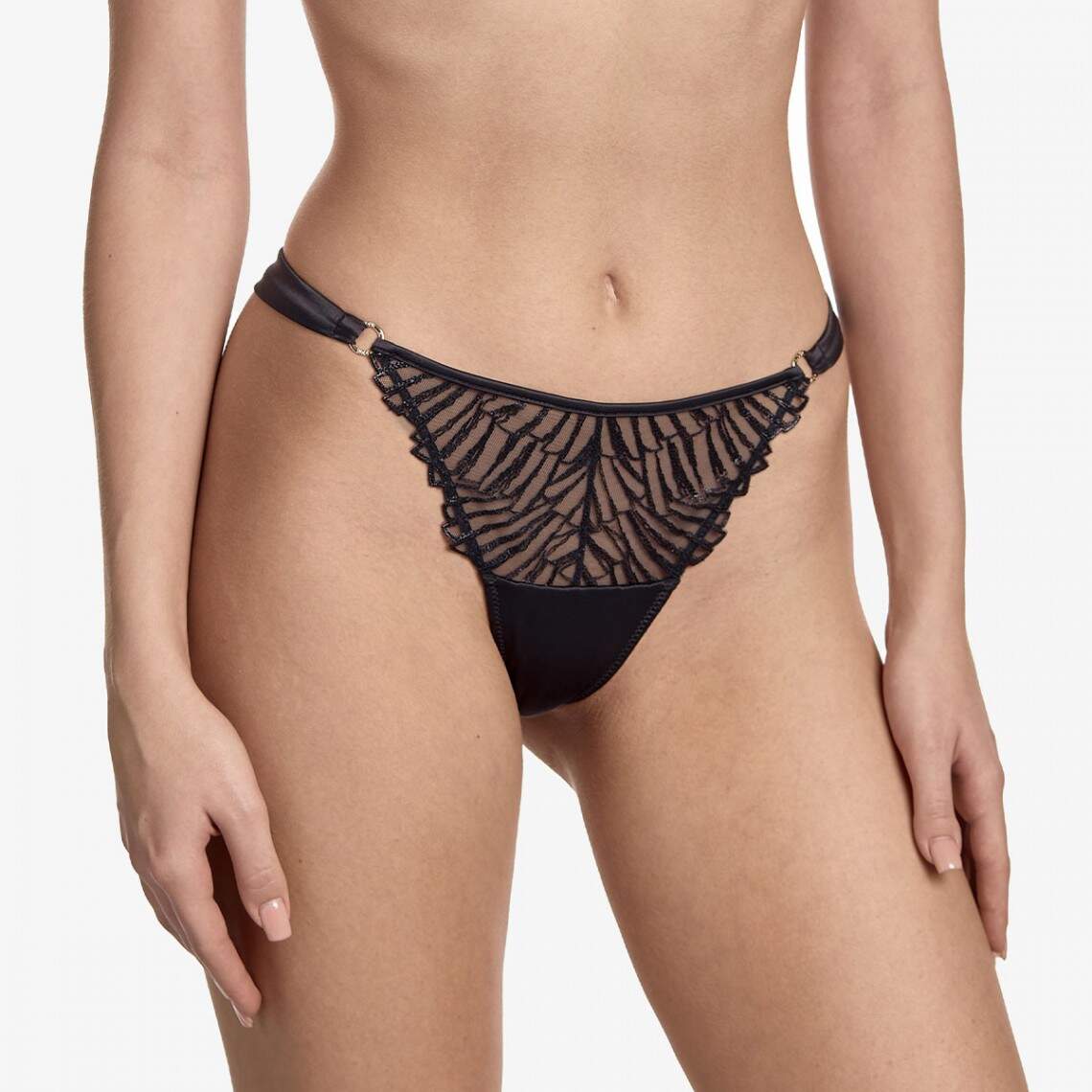 These low-rise thongs provide a feeling of weightlessness and sophistication. This striking model combines smooth satin in a deep black color with semi-sheer mesh, adorned with elegant abstract embroidery. The absence of adjusters ensures a flawlessly smooth silhouette that won't show under clothing. A comfortable cotton gusset provides maximum comfort. Composition: Polyamide 69%, Elastane 16%, Viscose 6%, Polyester 1%, Cotton 8%