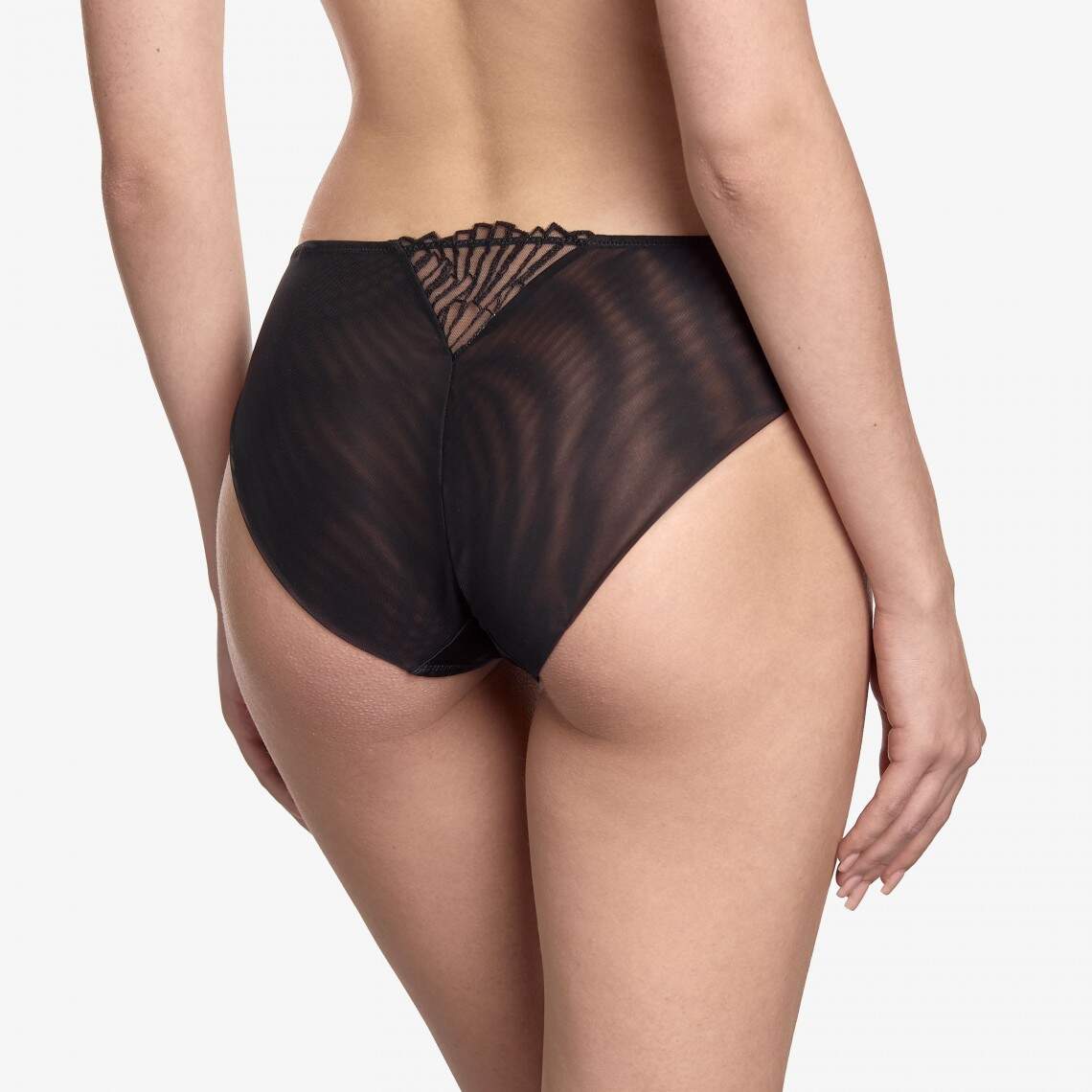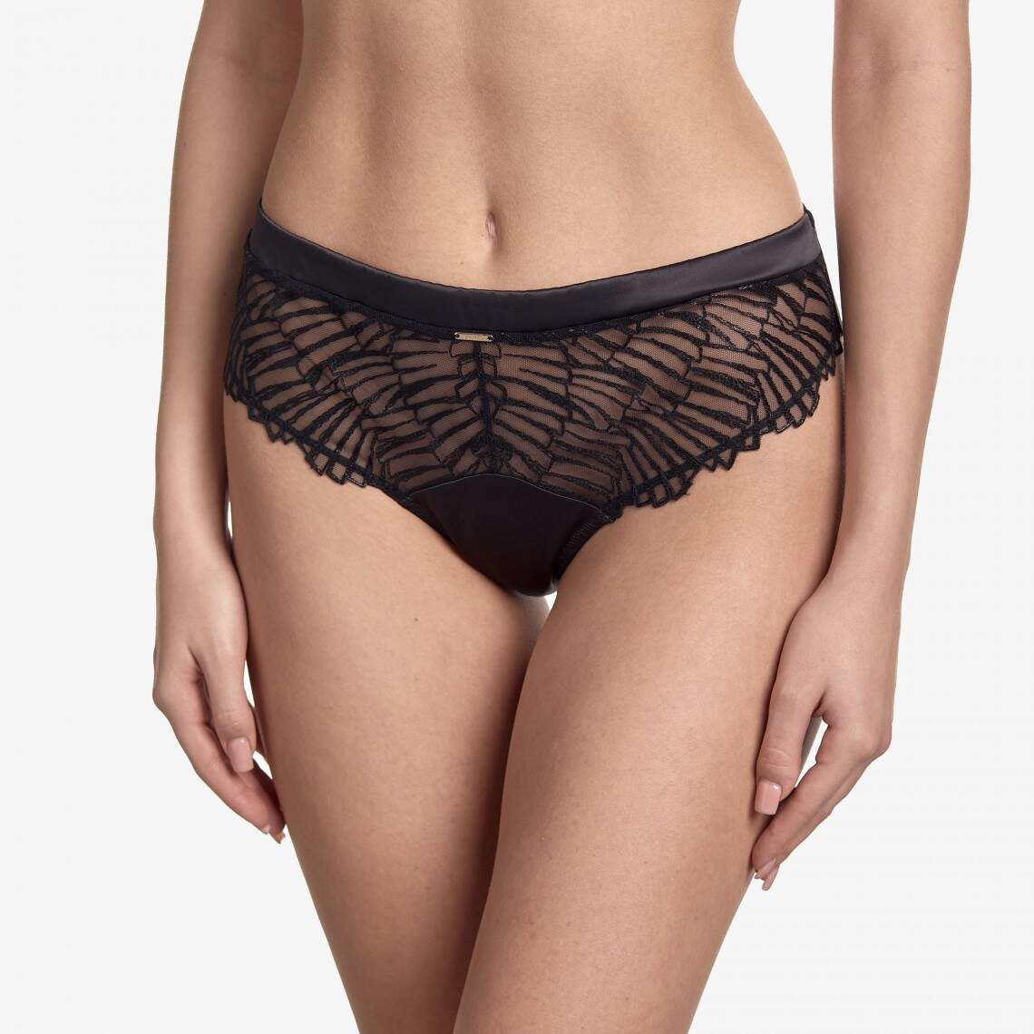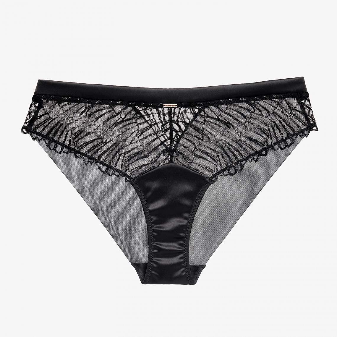 High-waisted briefs that create a sophisticated and graceful silhouette. This model is a combination of luxury and refinement: smooth black satin is joined with semi-sheer mesh, and the front is adorned with elegant abstract embroidery. A comfortable cotton gusset ensures maximum comfort. These briefs will perfectly complement any bra from this line, creating a harmonious and complete look. Composition: Polyamide 69%, Elastane 16%, Viscose 6%, Polyester 1%, Cotton 8%
