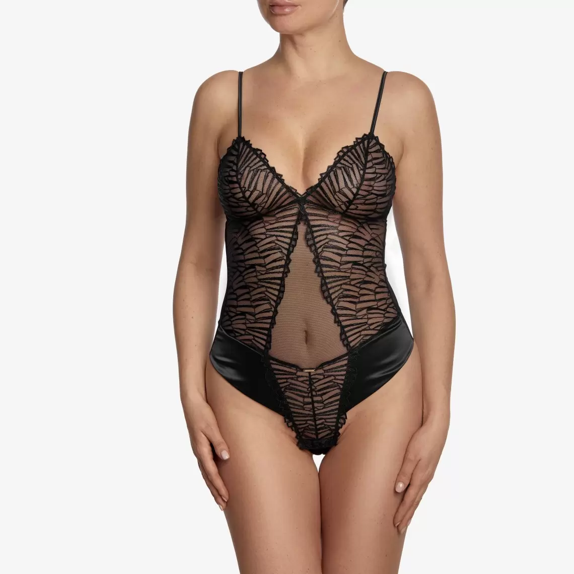 A luxurious bodysuit that will become a sophisticated accent in your wardrobe. Crafted from semi-sheer mesh, it is decorated with elegant abstract embroidery that creates the effect of a mysterious and alluring pattern on the skin. The thin adjustable straps and a sensual back cutout emphasize the refinement of your silhouette. Convenient fastenings at the back and over the gusset ensure a comfortable fit and functionality. Composition: Polyamide 69%, Elastane 16%, Viscose 6%, Polyester 1%, Cotton 8%