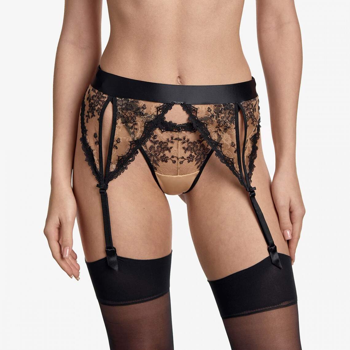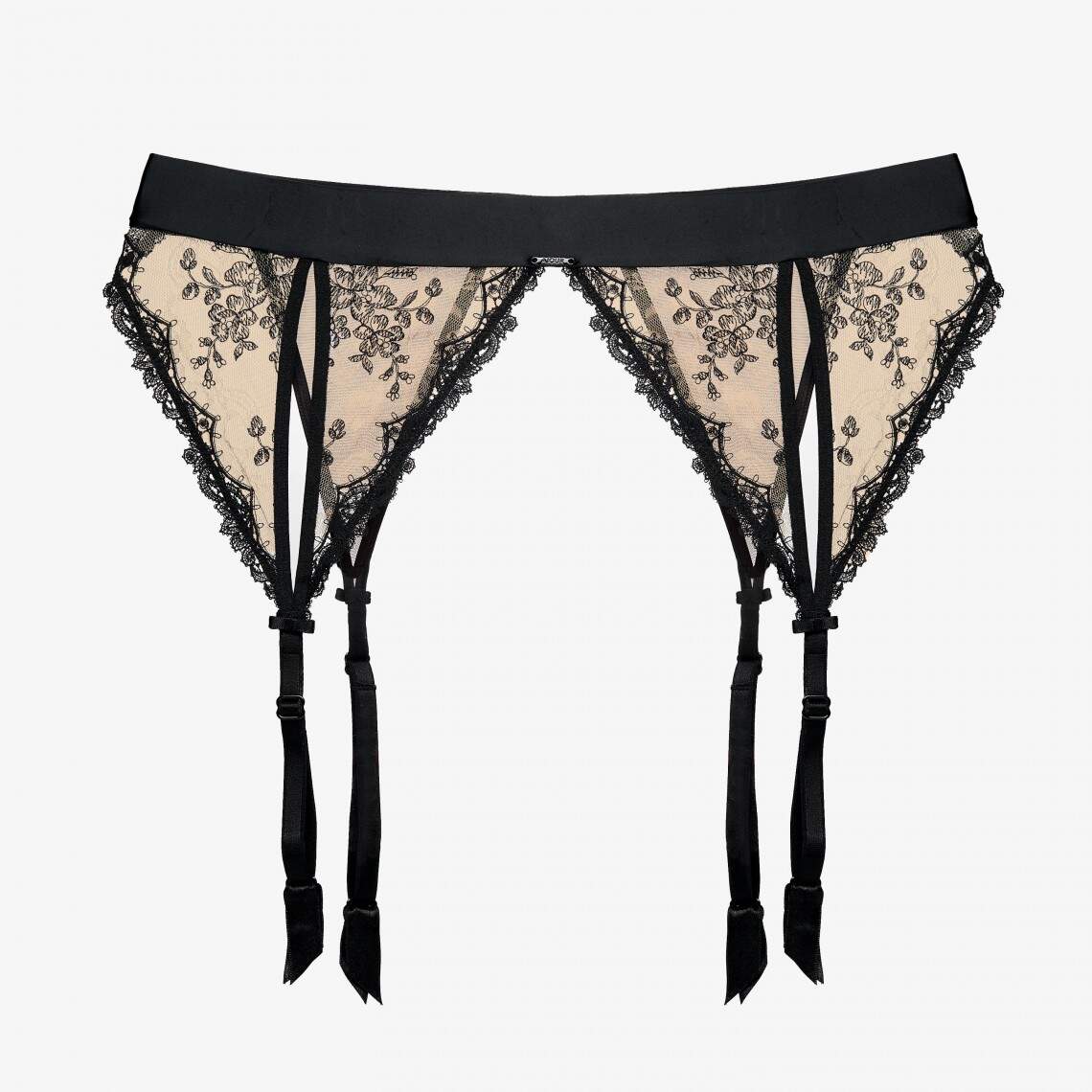 An original color and sophisticated design — this exquisite garter belt is a true highlight of your look. It is crafted from luxurious indigo-colored satin and beige mesh, which is adorned with elegant floral embroidery. A reliable fastener is located on the back panel for convenience, and the high-quality French clasps guarantee durability and ease of use, securely holding your stockings in place. Composition: Polyamide 72%, Elastane 18%, Viscose 8%, Polyester 2%