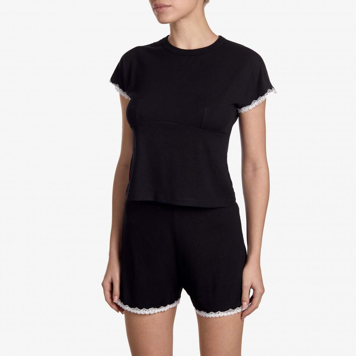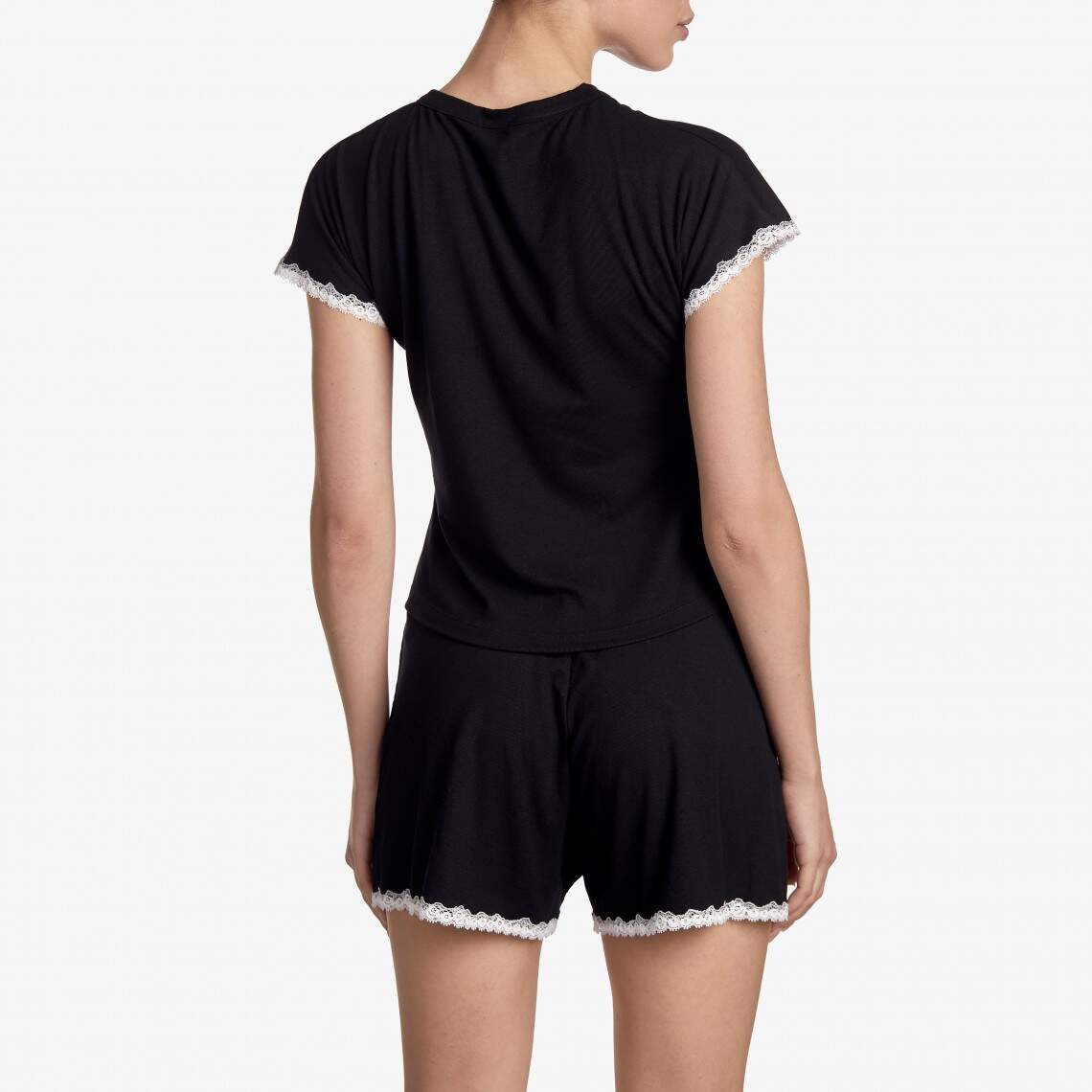 Experience the perfect combination of coziness and elegance at home. This loungewear set consists of a soft t-shirt and comfortable shorts, crafted from a pleasant-to-the-touch black jersey. The contrasting white lace trim on the edges adds a special charm to the model. The t-shirt has a classic round neckline, while the mini-length shorts with an elastic waistband ensure maximum comfort and freedom of movement. Composition: Rayon 92%, Cotton 8%