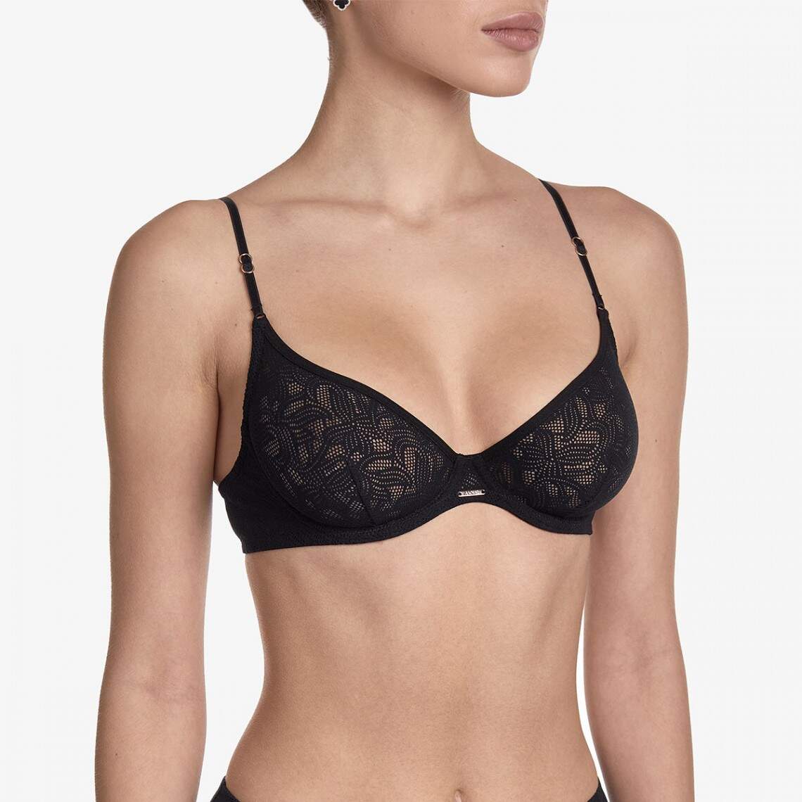 Create an alluring look with this foam-padded demi cup bra. It features underwire and is crafted from delicate black lace, adding sophistication to your look. The cup cut reveals the upper part of the bust, creating an attractive décolletage. Adjustable straps allow for a perfect fit. Composition: Polyester 88%, Elastane 12%