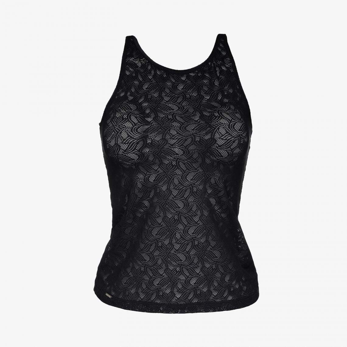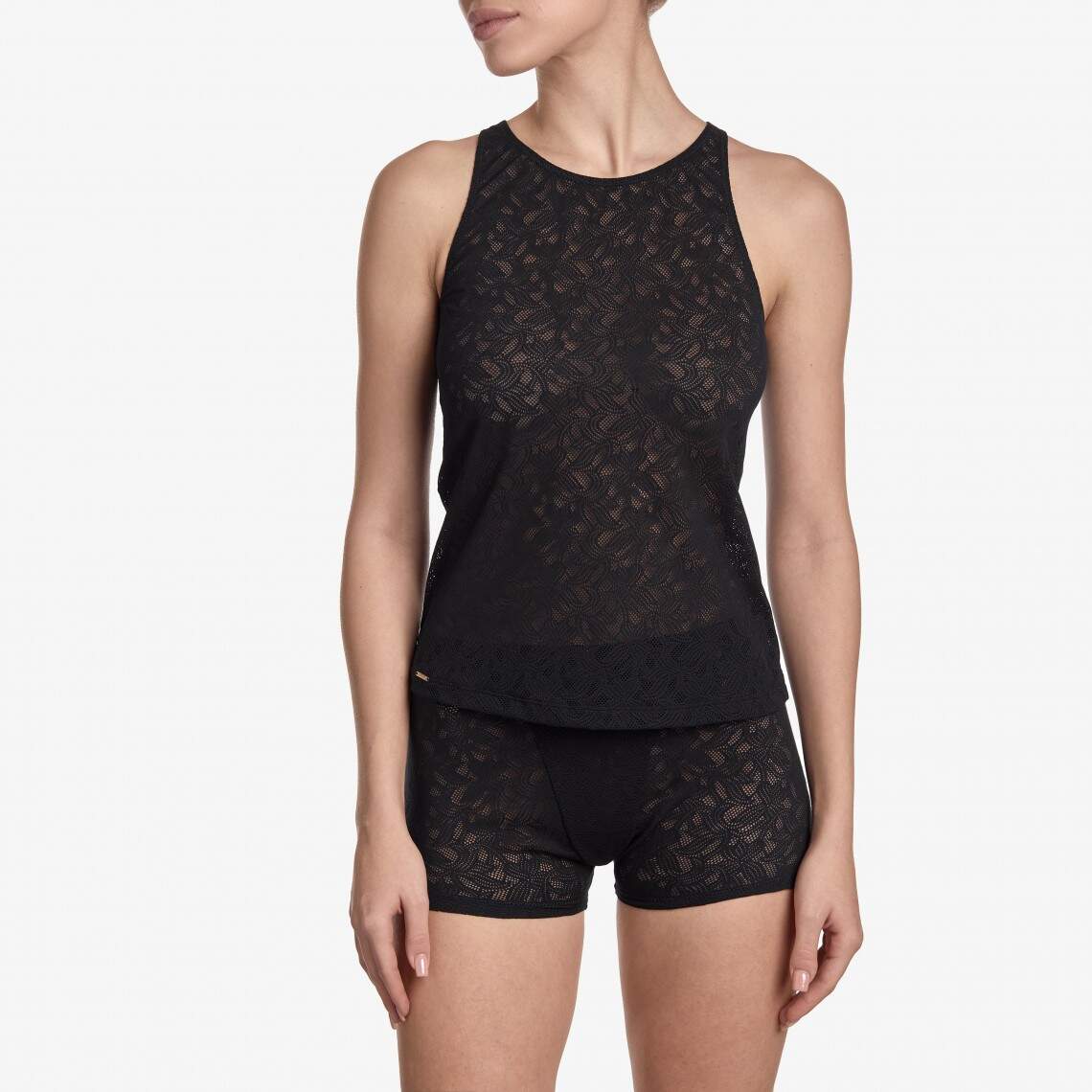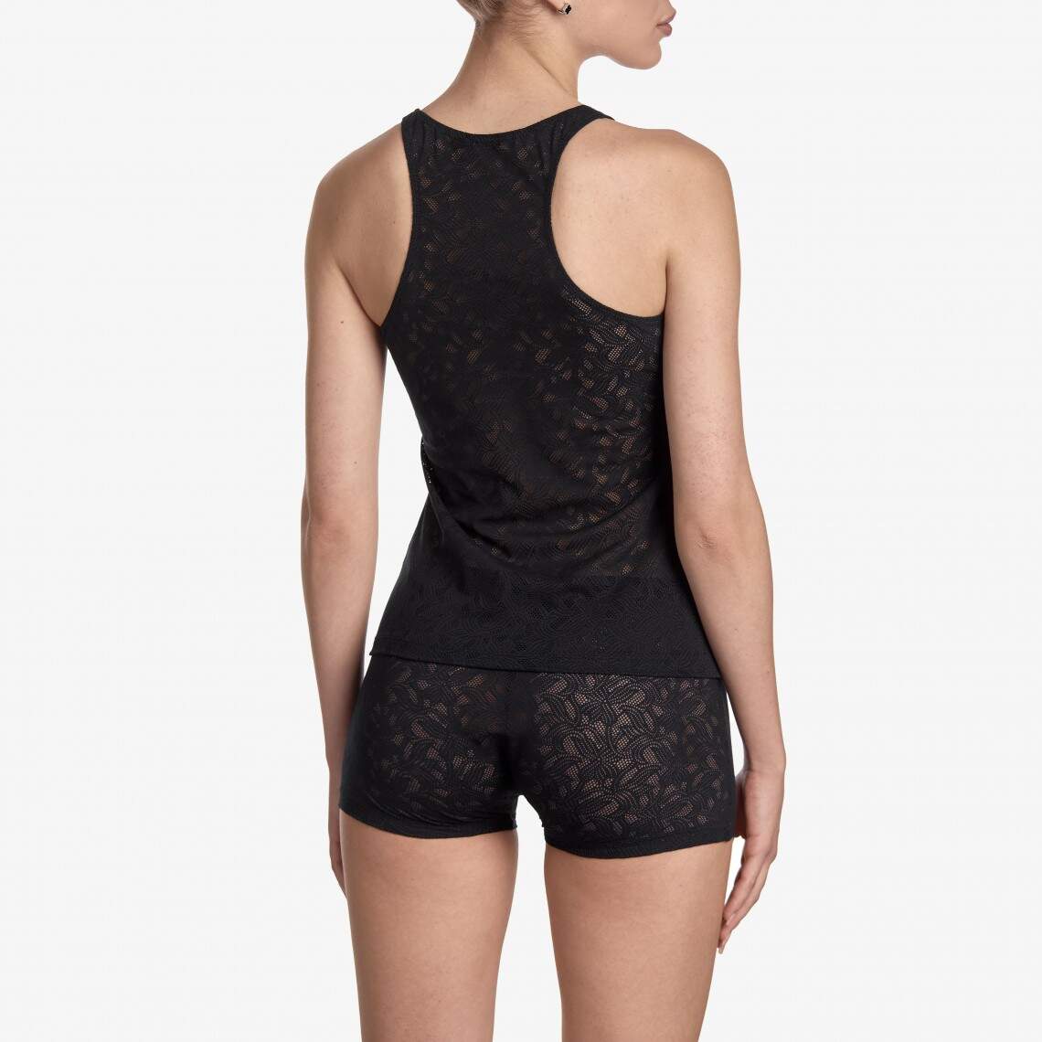 Create a sophisticated loungewear look with this elegant tank top that fits the figure perfectly. It is made from delicate black lace and features a fitted cut that accentuates your natural curves. This top is an excellent addition to the lace shorts from this same line. Composition: Polyester 100%