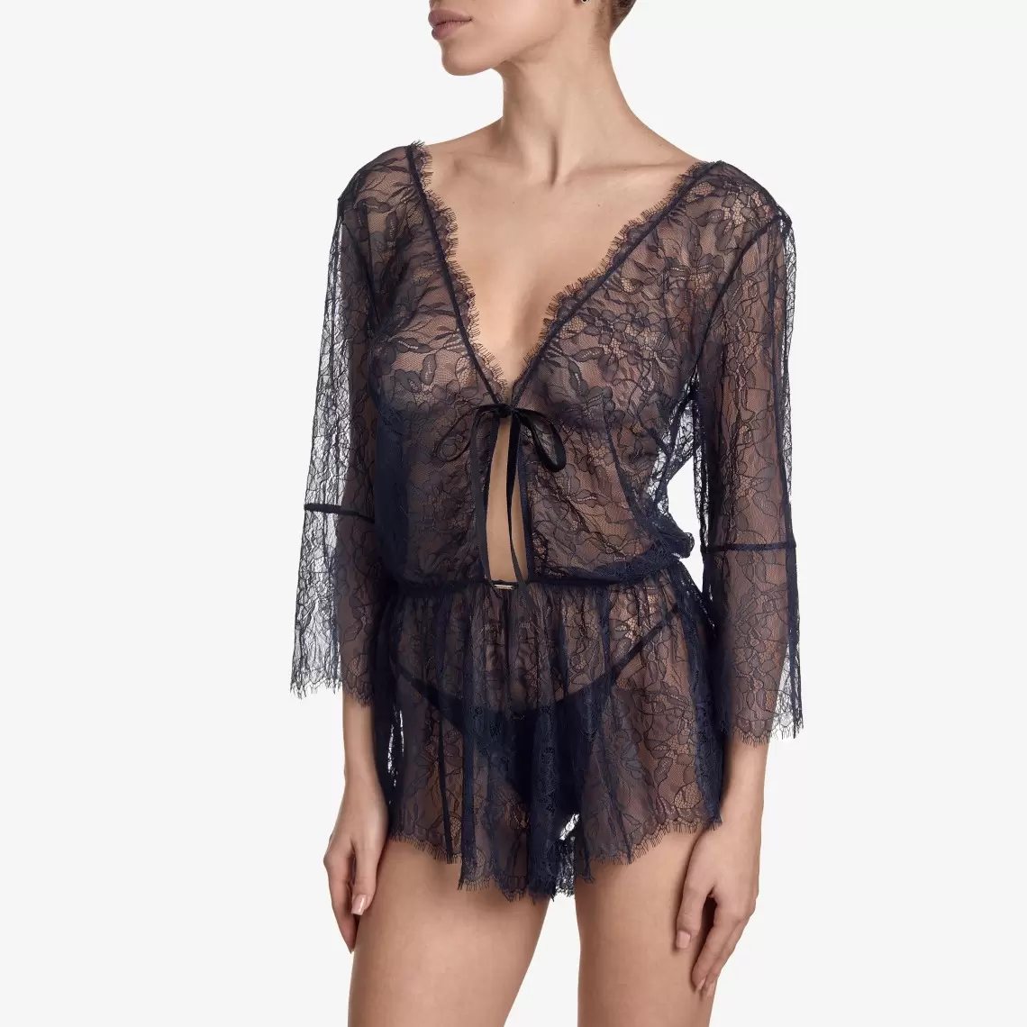 This sexy jumpsuit is not just lingerie, but a true embodiment of femininity. Crafted from delicate dark blue lace, it features a mini length that adds lightness to the look. The front is adorned with a tempting cutout and a bow, which adds playful notes, while a V-neckline on the back makes it incredibly sensual and elegant. Composition: Polyamide 72%, Elastane 18%, Viscose 8%, Polyester 2%
