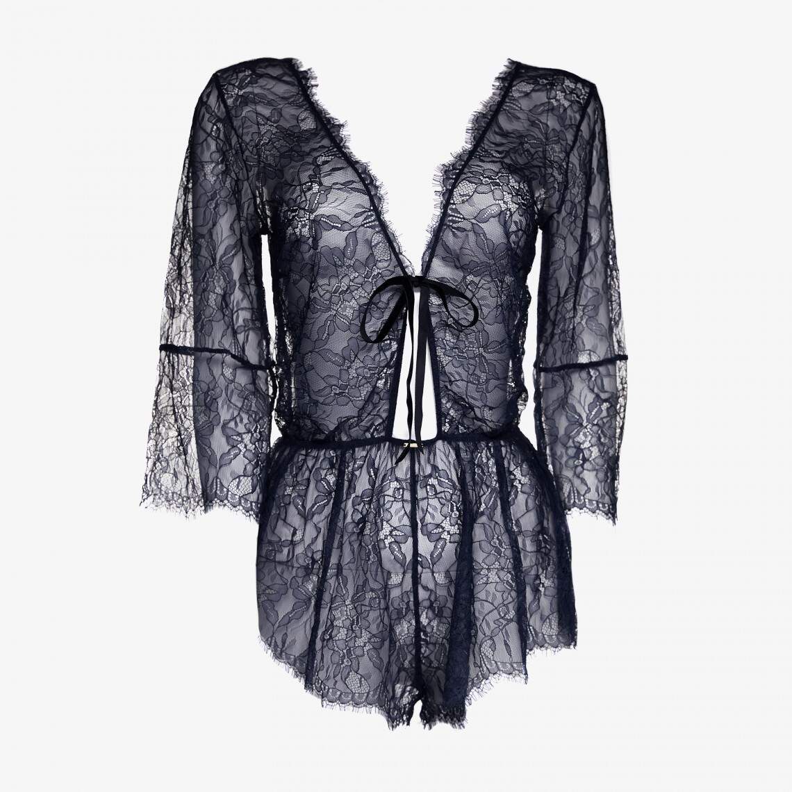 This sexy jumpsuit is not just lingerie, but a true embodiment of femininity. Crafted from delicate dark blue lace, it features a mini length that adds lightness to the look. The front is adorned with a tempting cutout and a bow, which adds playful notes, while a V-neckline on the back makes it incredibly sensual and elegant. Composition: Polyamide 72%, Elastane 18%, Viscose 8%, Polyester 2%