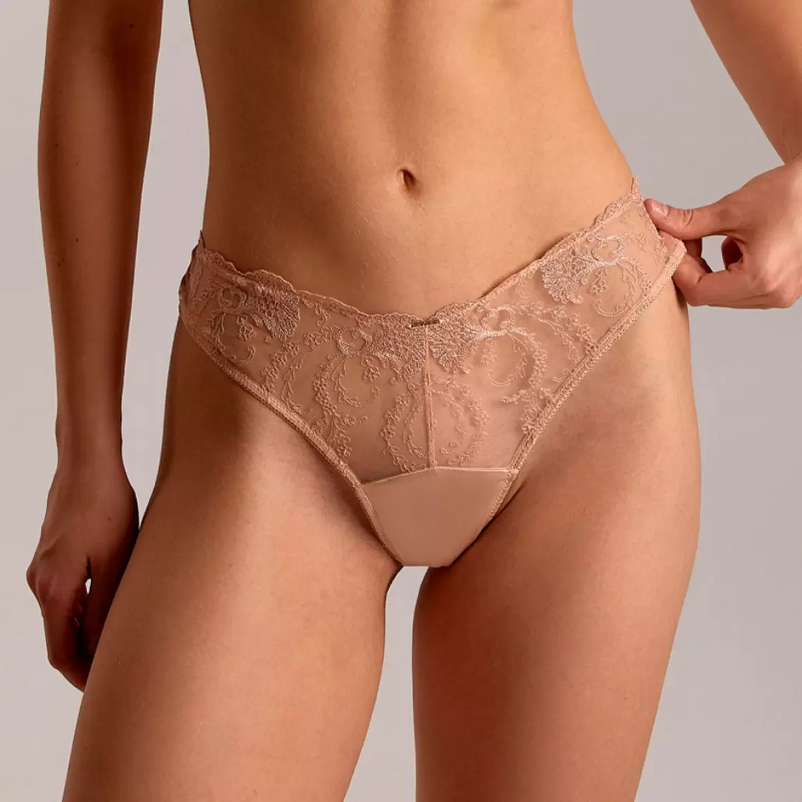 These mid-rise Brazilian panties are crafted for those who choose sophistication in every line. The combination of noble smooth satin and semi-transparent mesh, adorned with filigree embroidery, creates a luxurious interplay of textures. High-cut leg openings visually elongate the legs, adding special grace and confidence to the silhouette. A natural cotton gusset ensures intimate comfort, making this model a standard of your everyday luxury. Composition: 69% polyamide, 16% elastane, 6% viscose, 1% polyester, 8% cotton.