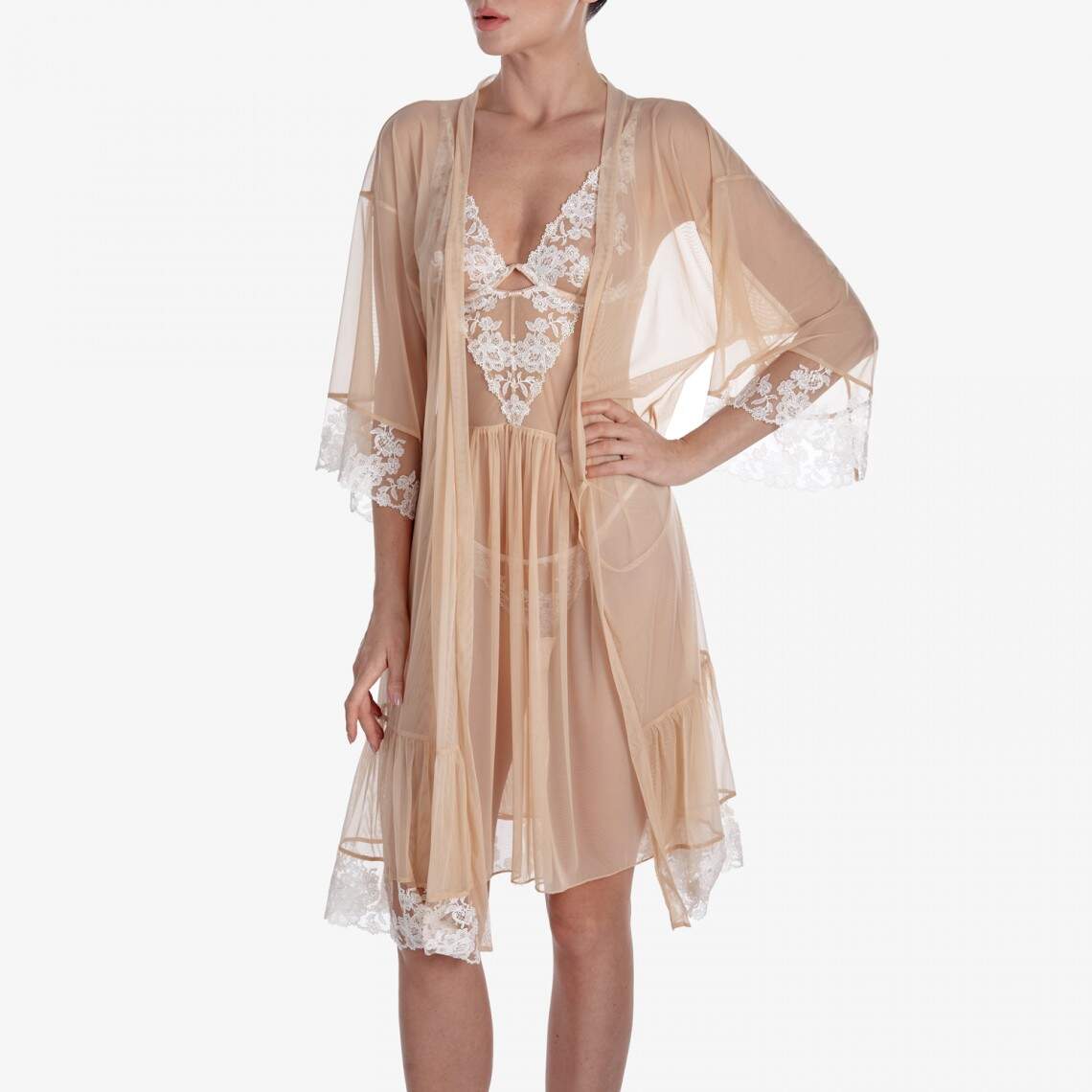 Sexy beige kimono robe. Knee length. Made of translucent mesh. Sleeves and bottom of this kimono are decorated with vanilla embroidery. Satin ribbon is tied at the waist. Model height – 172 cm. Polyamide 72%, elastane 18%, viscose 8%, polyester 2%