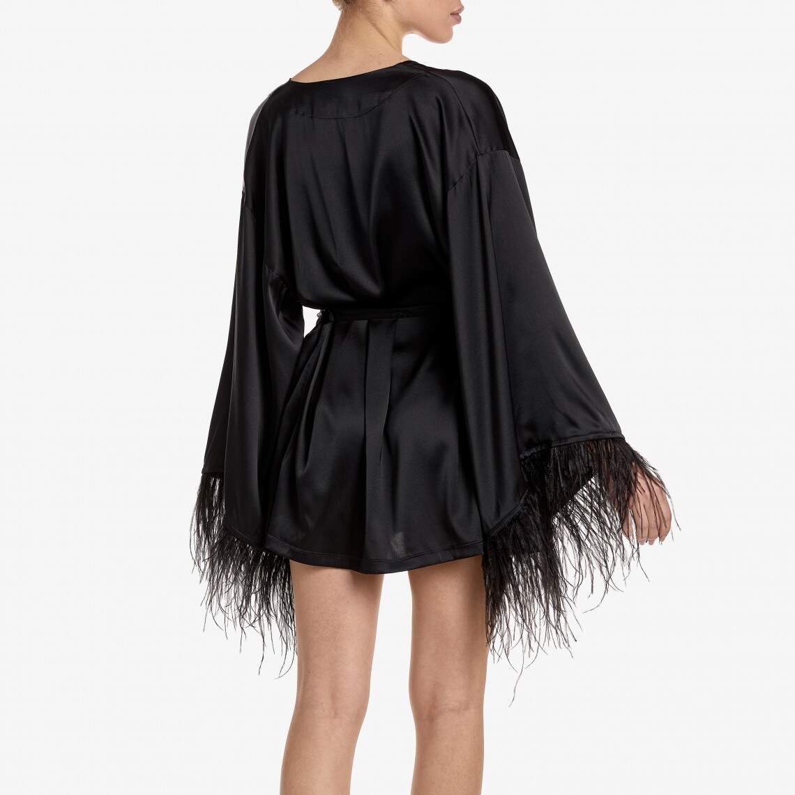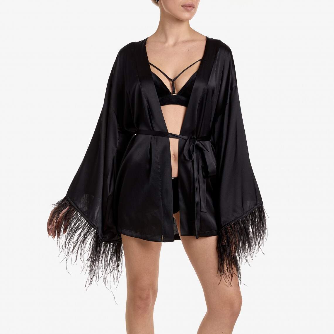 Feel the touch of unmatched luxury—this black kimono robe is crafted from delicate, petal-soft natural silk. The refined cut and mini length will accentuate the grace of your figure, while its main decoration, the wide sleeves, are adorned with airy black feathers, adding a sense of drama and sophistication to your look. With a soft tie belt, you can elegantly define your waist. This robe is a true embodiment of luxury. Composition: Natural silk 92%, Spandex 8%