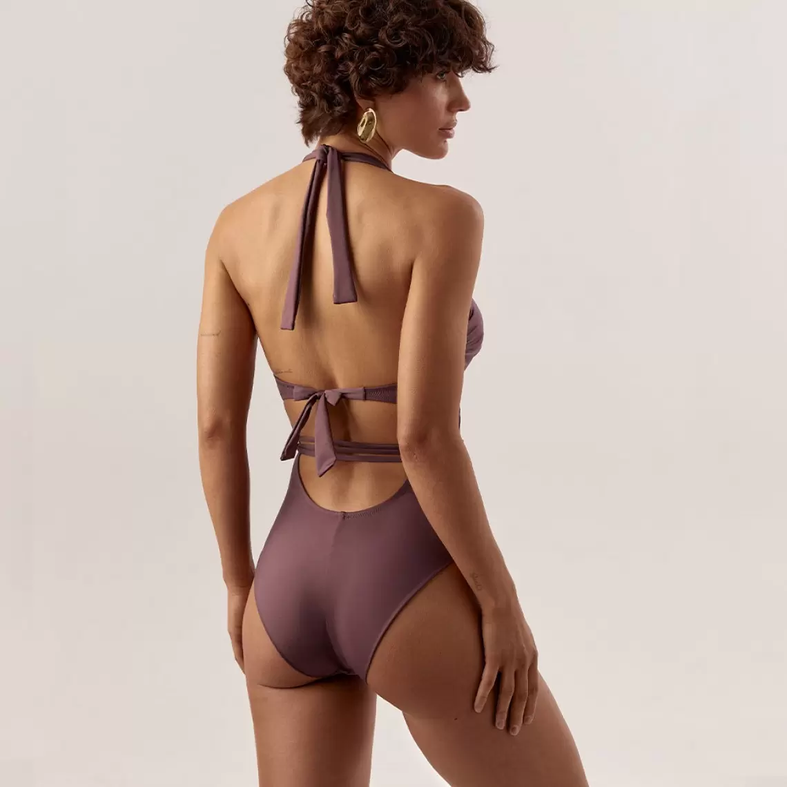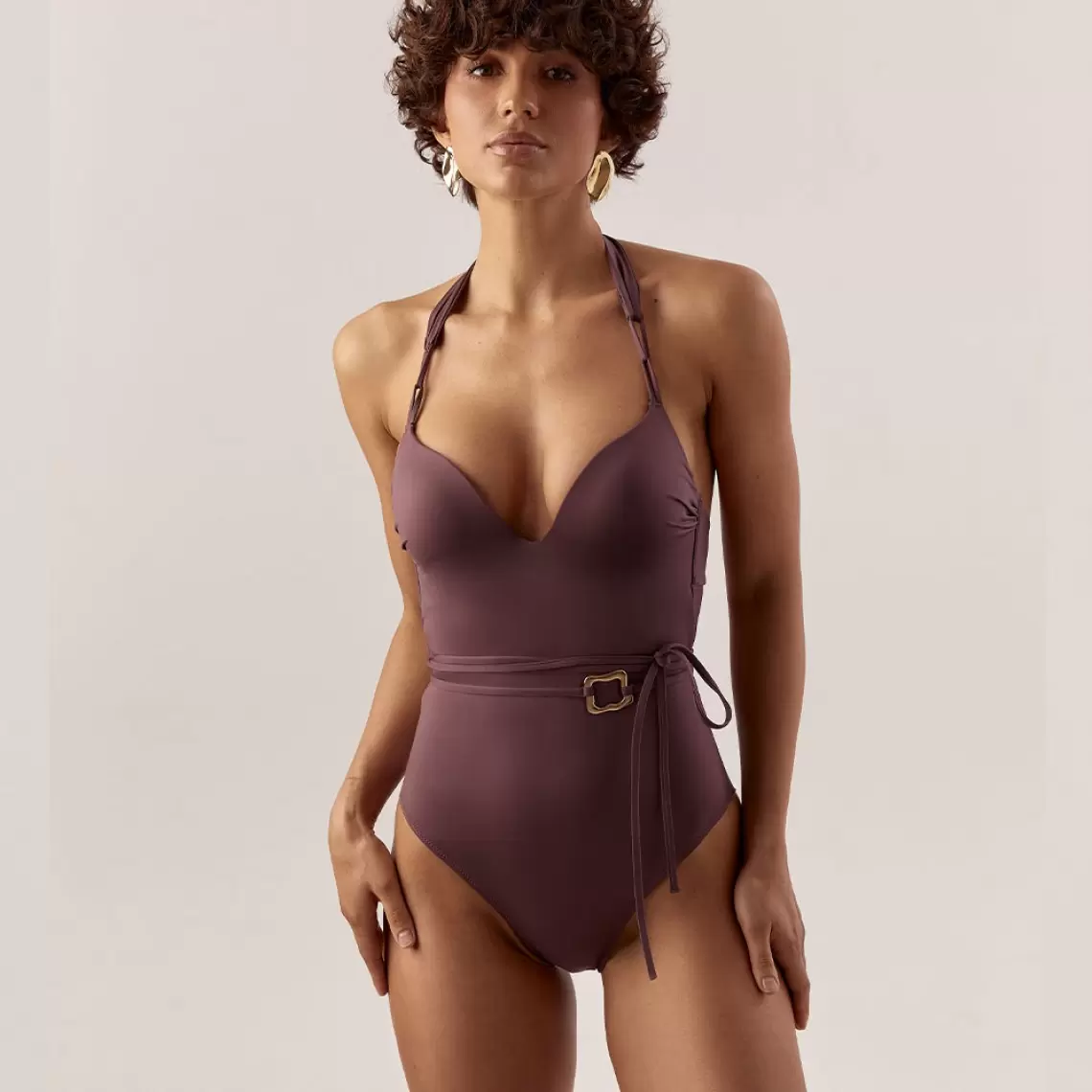 This one-piece swimsuit is designed to shape the silhouette, ensuring maximum comfort and confidence. The molded cup creates a flawless rounded breast shape, giving them an aesthetic look. The model features underwire and side boning, which guarantees secure fixation and proper volume distribution. The back of the swimsuit is made of a double layer of fabric, providing a light shaping effect, opacity, and a perfect fit on the buttocks. An elegant belt adorned with a luxurious embellishment accentuates the waist. If desired, the belt can be removed, changing the look from sophisticated to minimalist. Composition: 80% polyamide, 20% elastane.